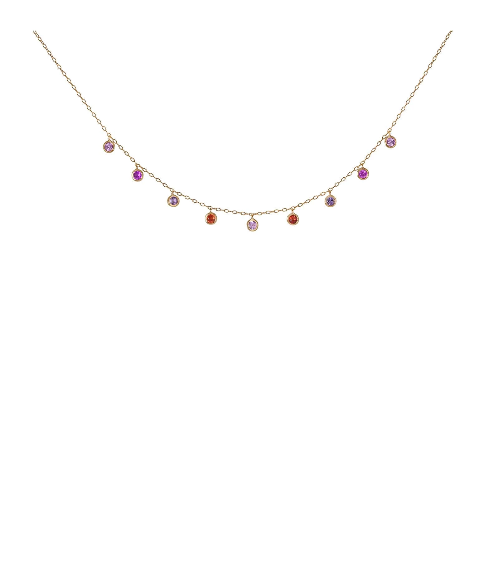 Collier court en or jaune avec 9 pierres serti clos saphir rose clair, saphir orange, améthyste et saphir rose fuchsia.