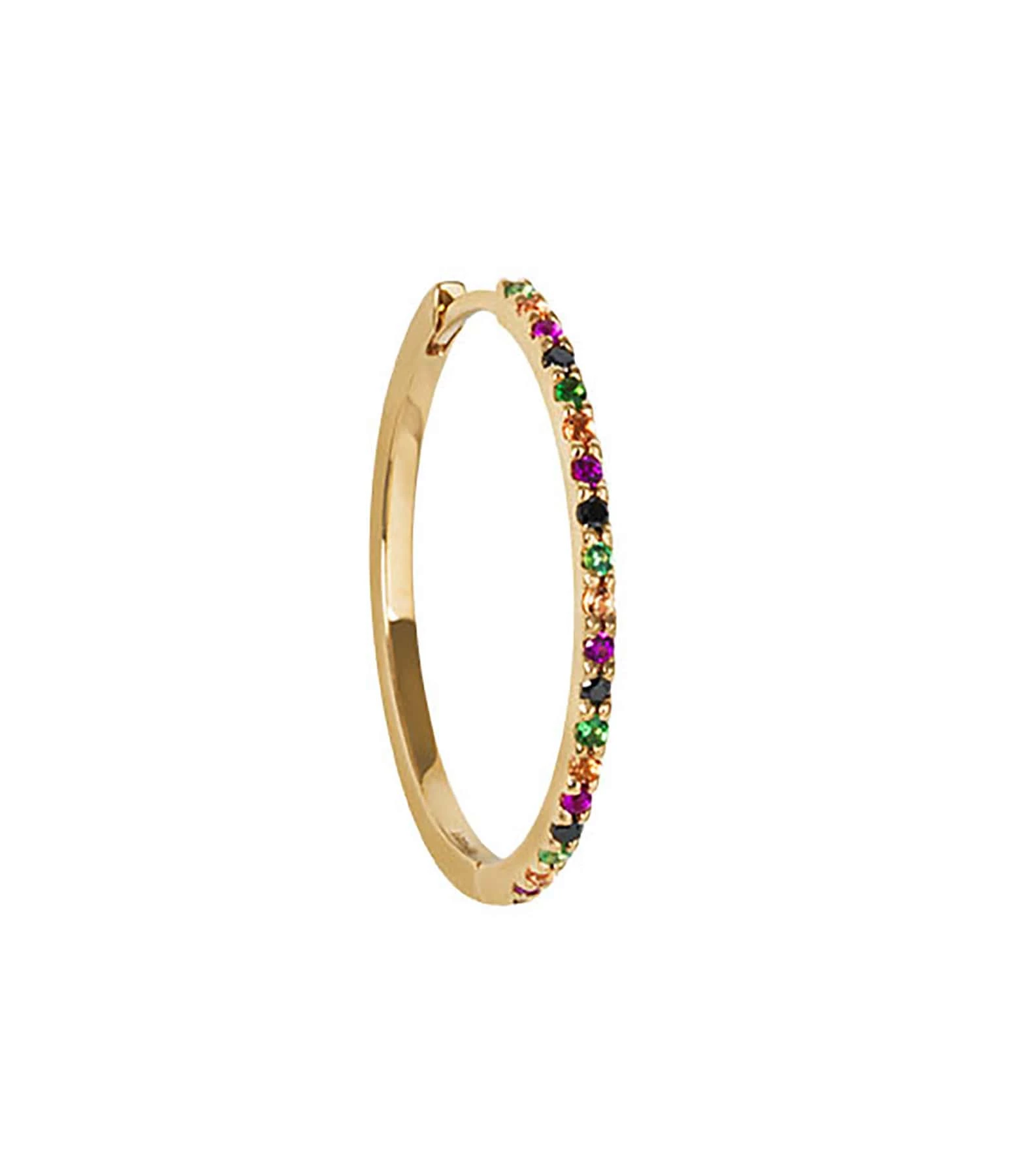 Boucle d’oreille créole large en or jaune et multi pierres (Ruby, tsavorite, diamant noir et citrine). Vendue à l’unité.