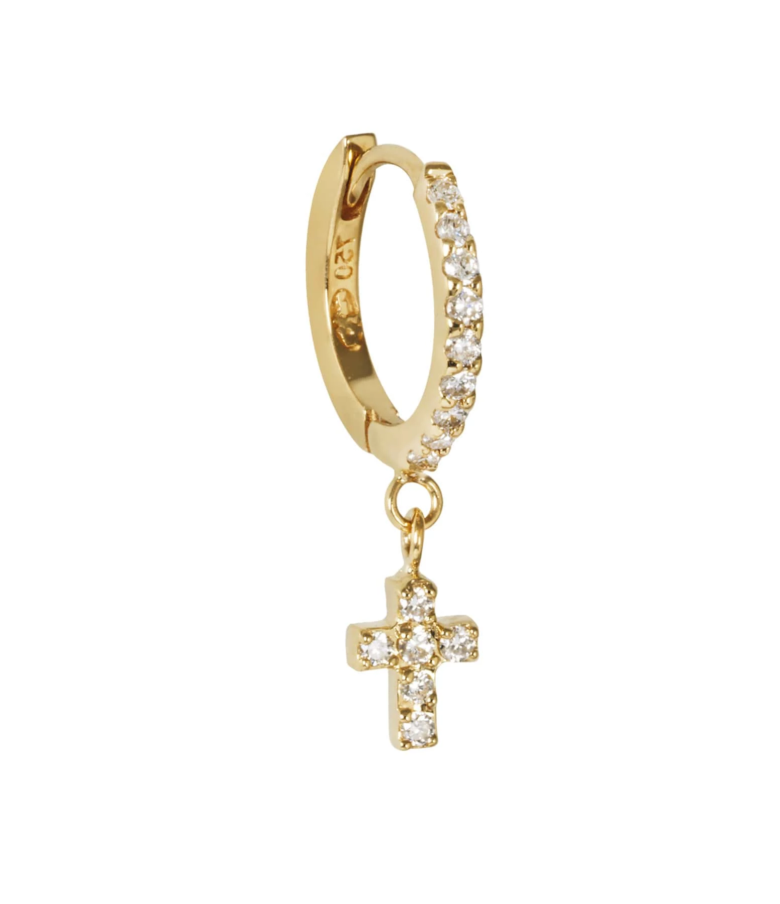Mini créole en or jaune, agrémentée d’un pendentif croix, tous deux pavés de diamants sur la face. Fermoir cliquet.