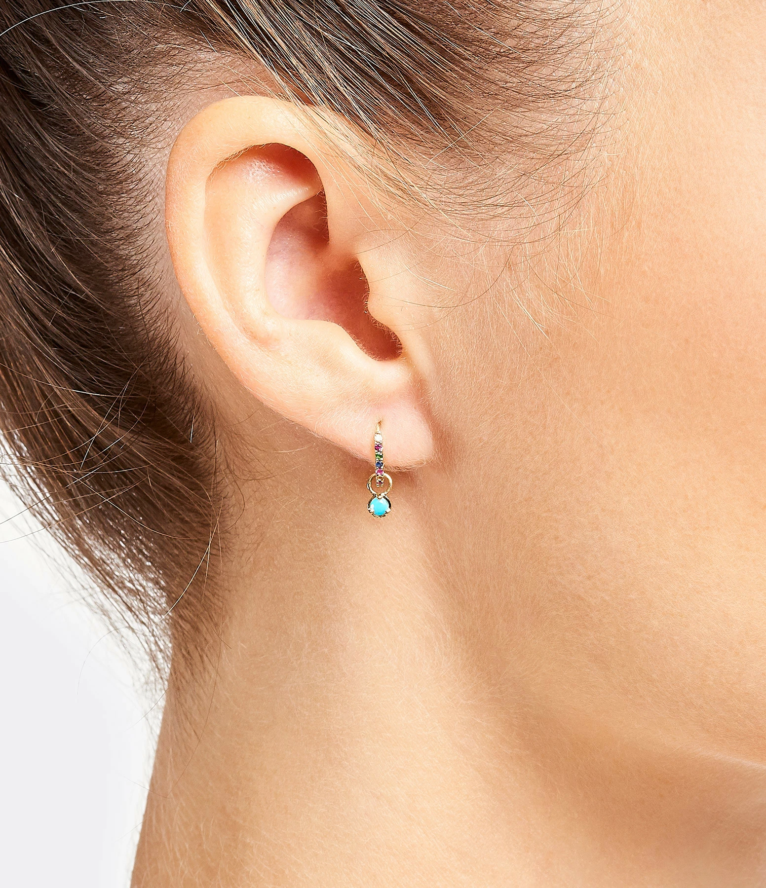 Mini créole en or jaune sertie de saphirs multicolores. Fermoir cliquet.