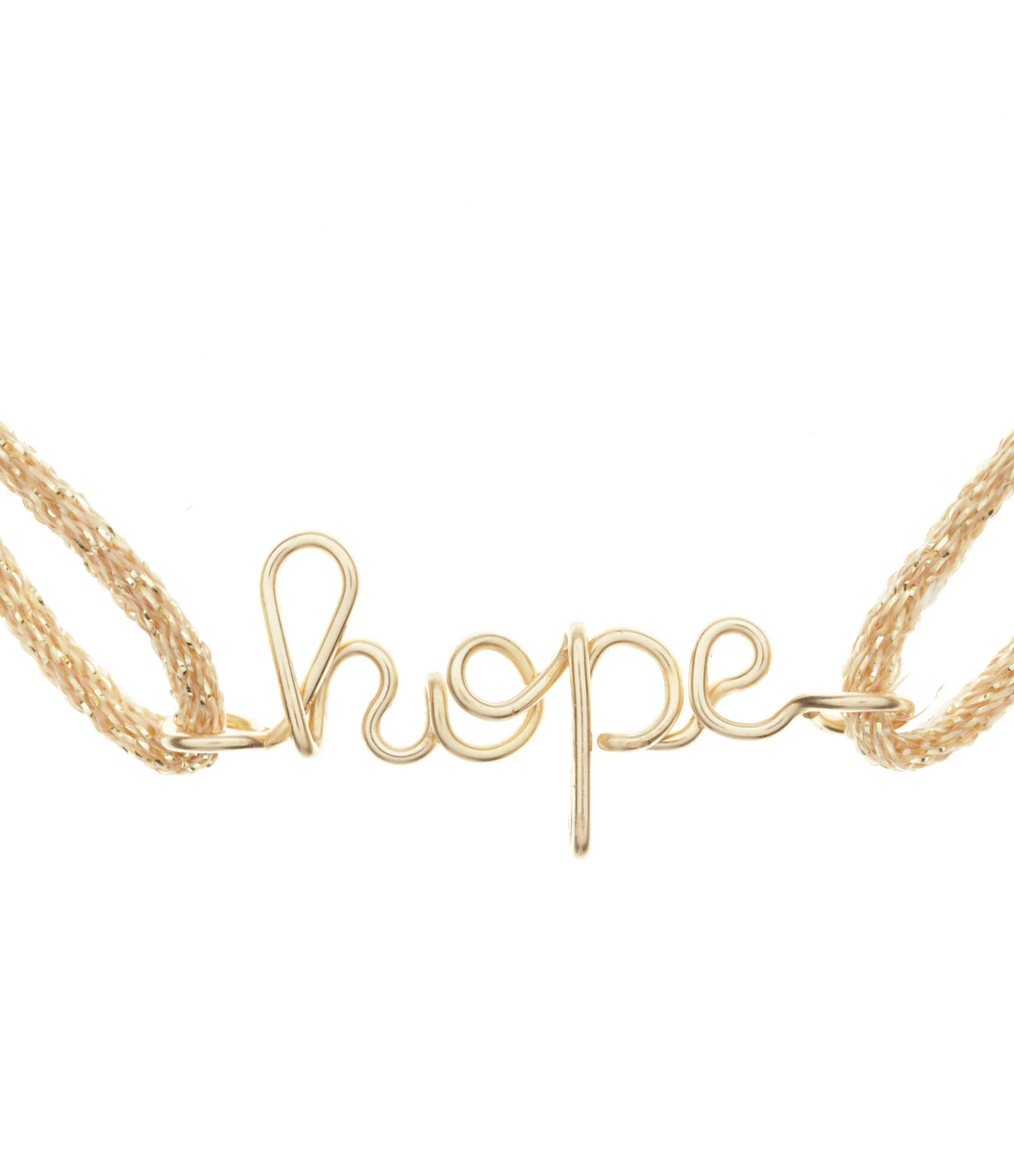Bracelet sur cordon de soie et lurex, agrémenté du mot “hope” en gold filled. Cordon ajustable par nœud coulissant.