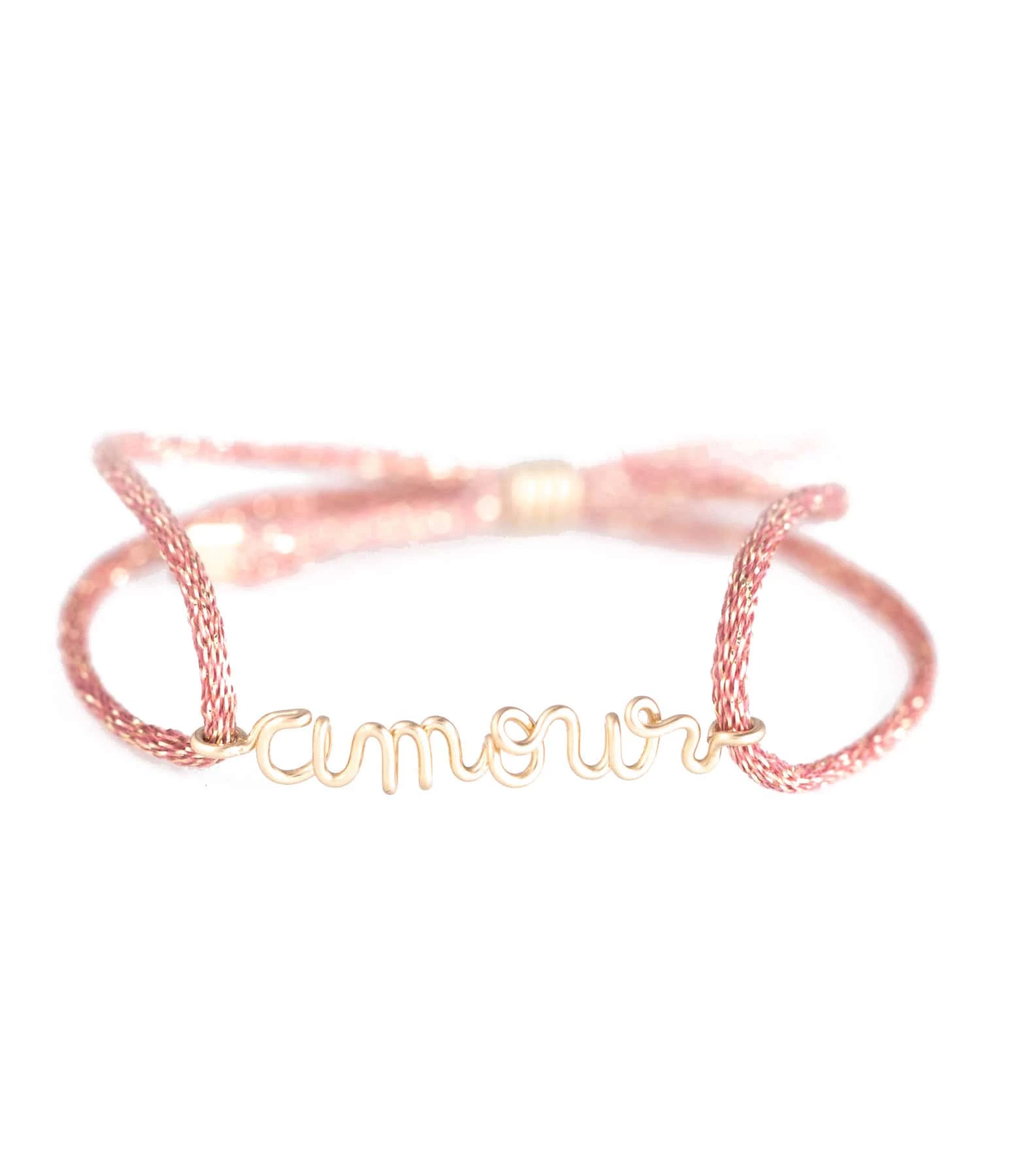 Bracelet pour enfant sur cordon de soie et lurex, agrémenté d’un fil d’or gold filled formant le mot “Amour”. Cordon ajustable par nœud coulissant.
