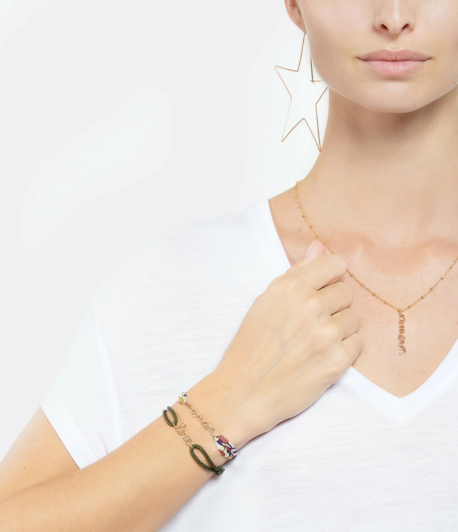 Duo de bracelets en fil gold filled 14 carats sur tissu en coton tissé. Un bracelet avec un pendentif cœur, l’autre avec l’inscription “maman”.