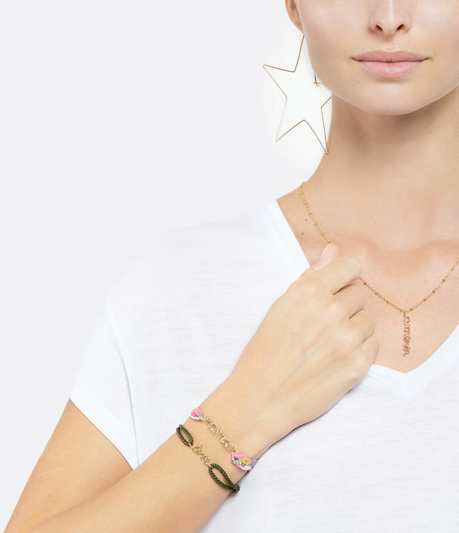 Duo de bracelets en fil gold filled 14 carats sur tissu en coton tissé. Un bracelet avec un pendentif cœur, l’autre avec l’inscription “maman”.