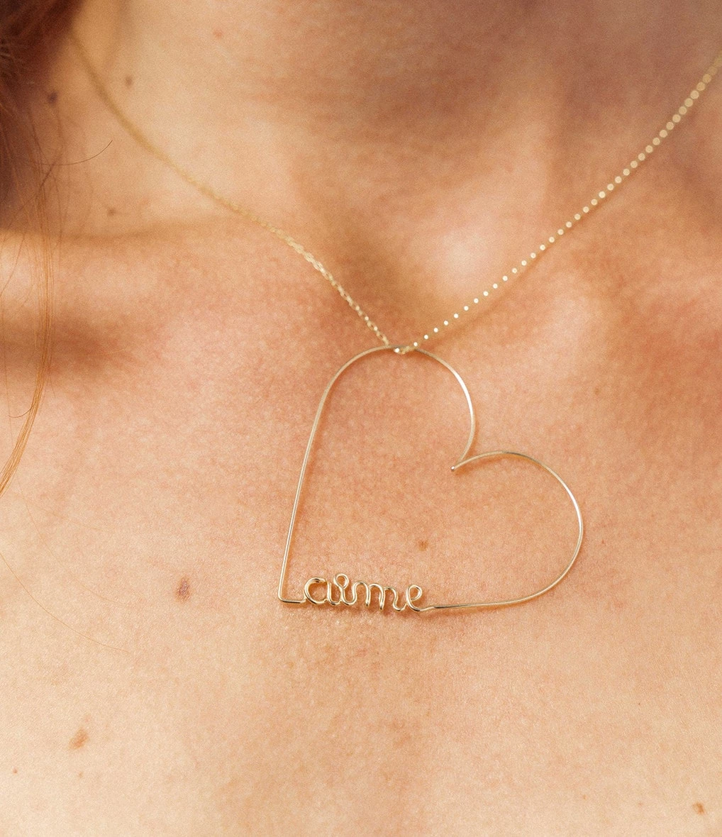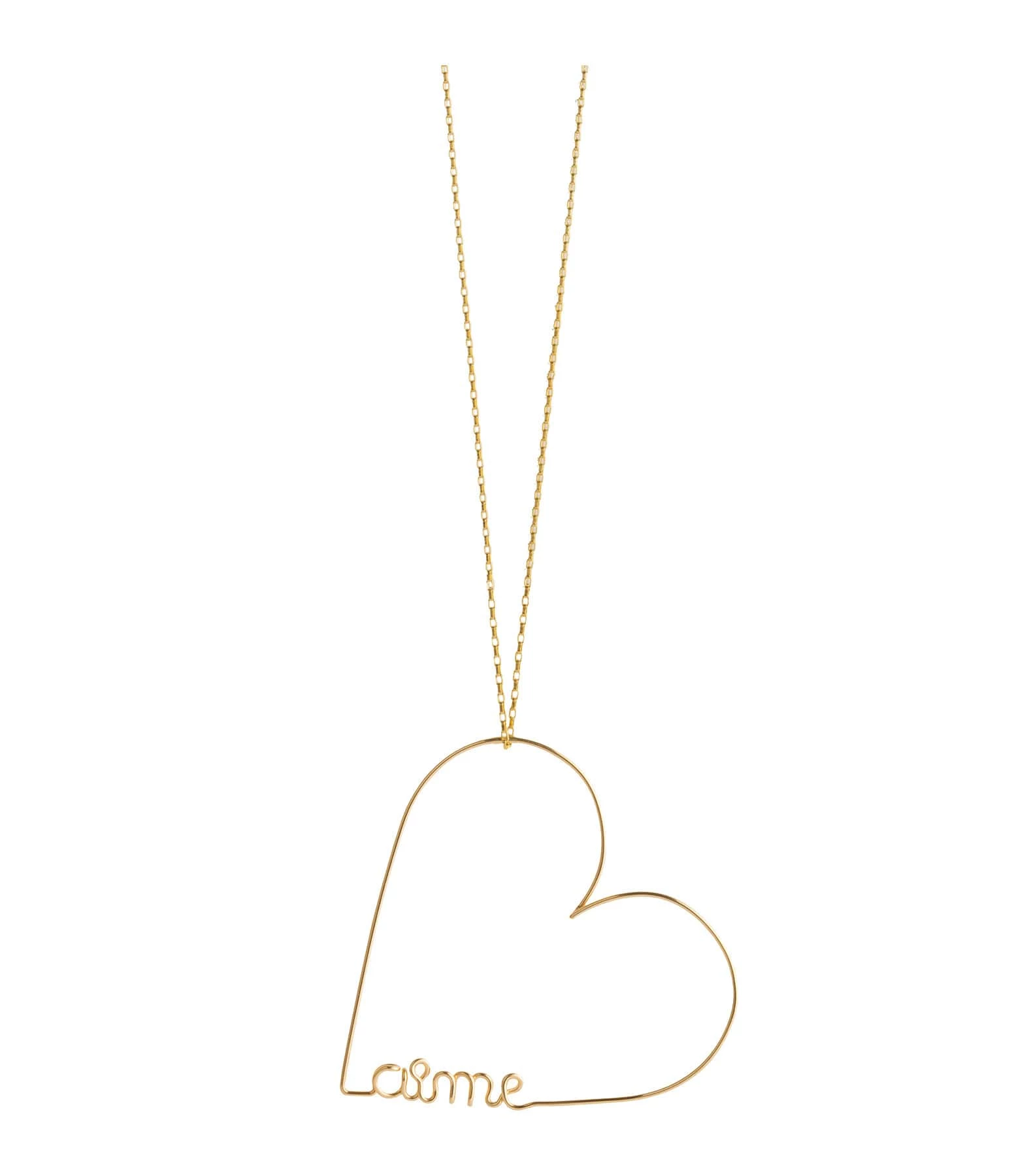 Collier sur chaîne en or gold filled avec un pendentif composé d’un cœur avec l’intitulé “Aime” inscrit à l’intérieur. Fermoir classique à ressort avec contre anneau.