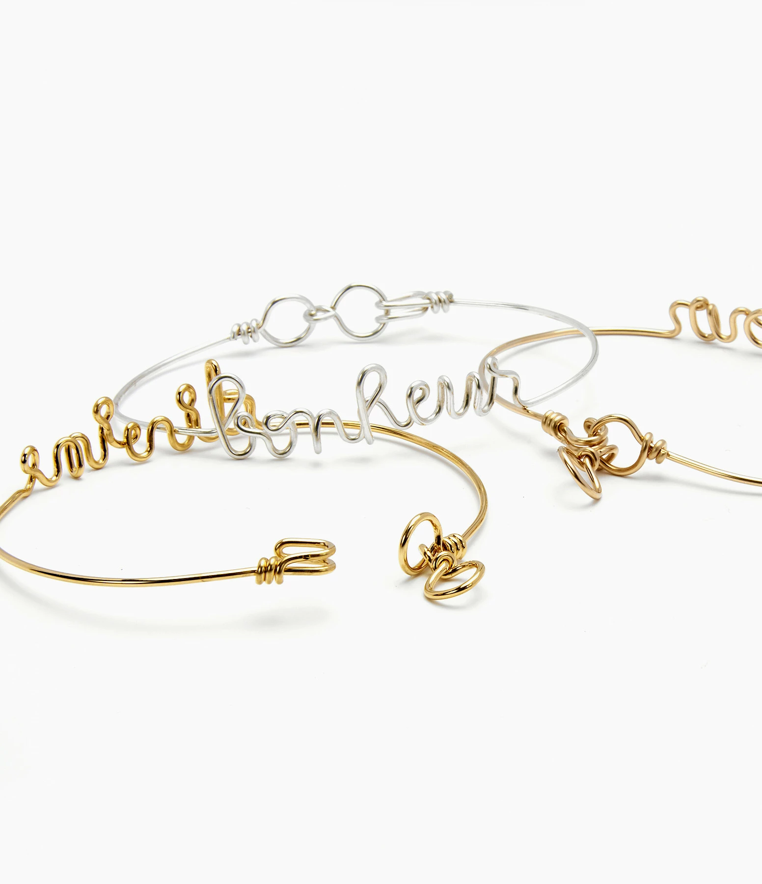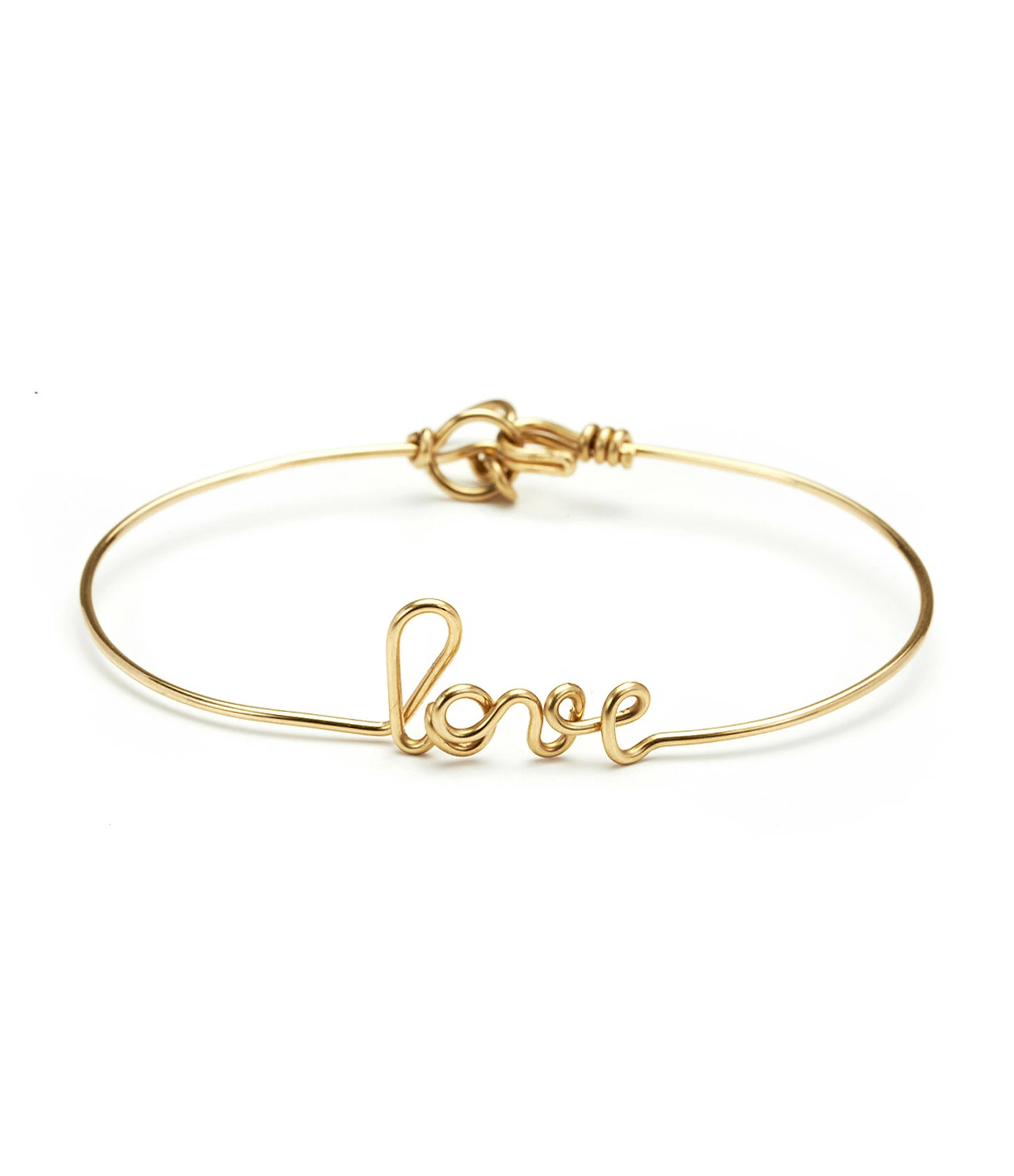 Bracelet composé d’un seul et unique fil d’or gold filled, formant le mot “Love”. Se porte ajusté.
