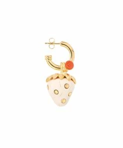 Boucle d’oreille créole ornée d’une fraise en bakélite ivoire et inclusions dorées, et d’une petite cornaline. Fermoir poussette.