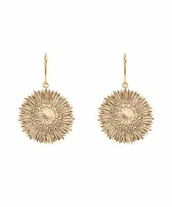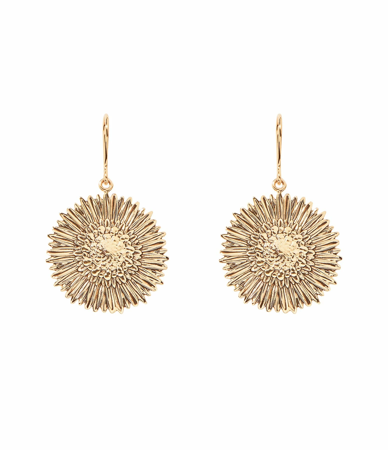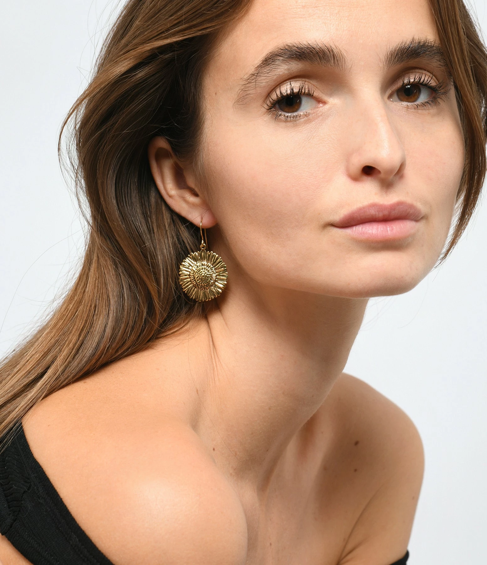 Boucles d’oreilles dormeuses en forme de fleurs de tournesol dorées.
