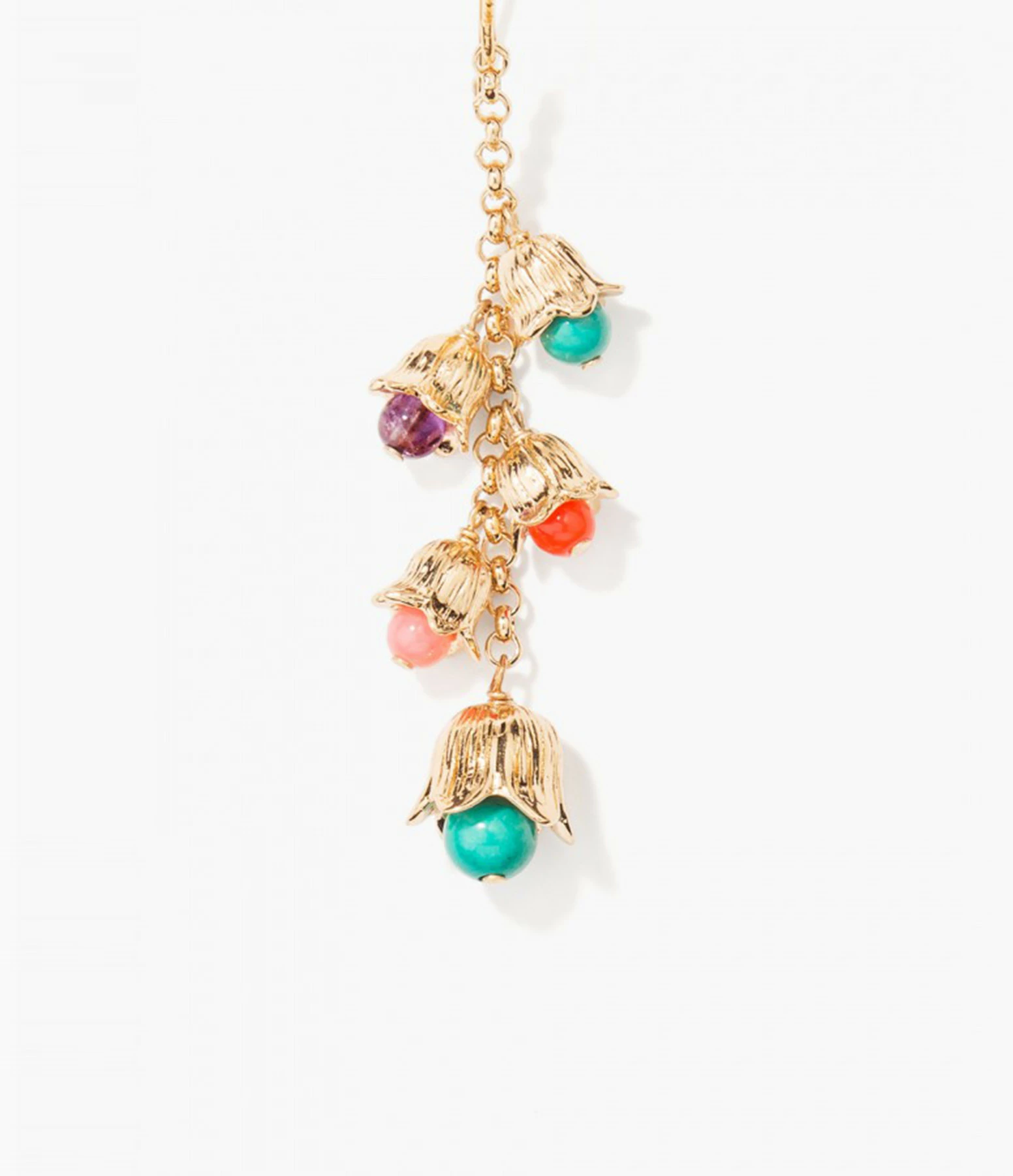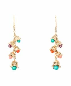 Boucles d’oreilles dormeuses, agrémentées de clochettes articulées renfermant des perles multicolores : améthyste, turquoise, bambou et verre.
