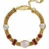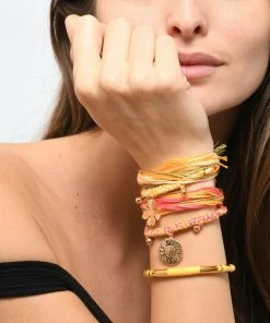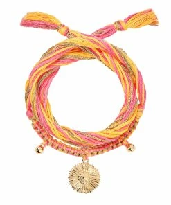 Bracelet en fils de coton orange, rose et doré, orné d’une fleur et de deux perles dorés. À nouer.