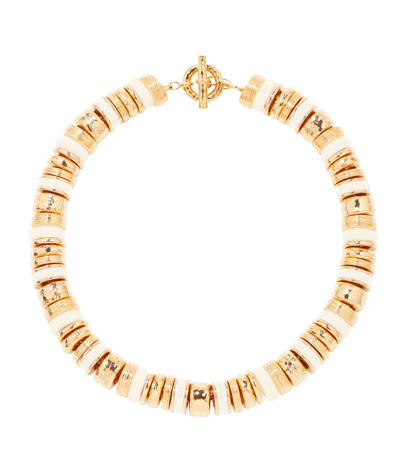Collier en perles doré martelées et bakélite ivoire. Fermoir en T.