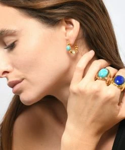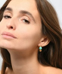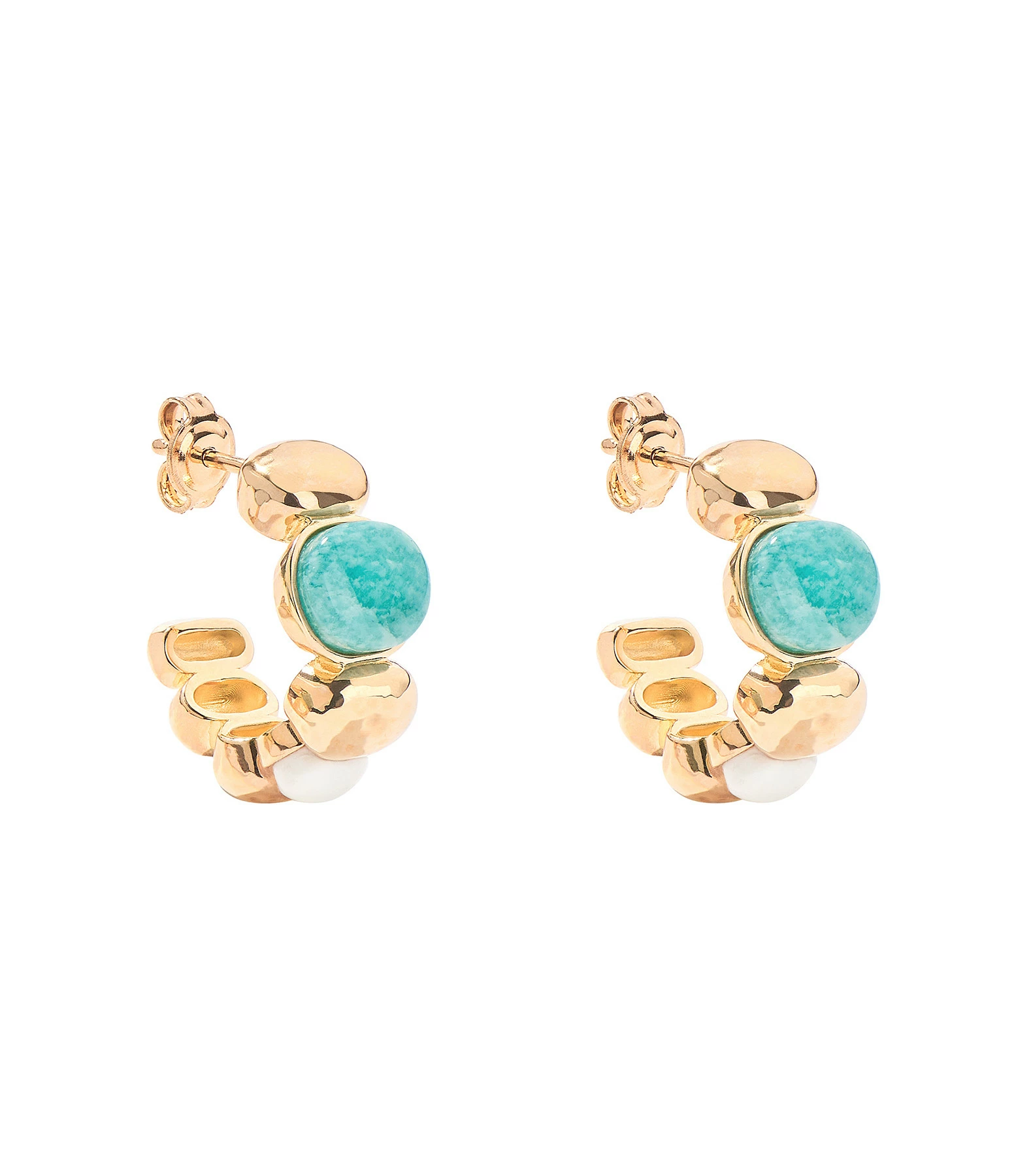 Boucles d’oreilles doré avec pierre d’amazonite et bakélite ivoire. Fermoirs poussettes.