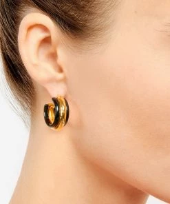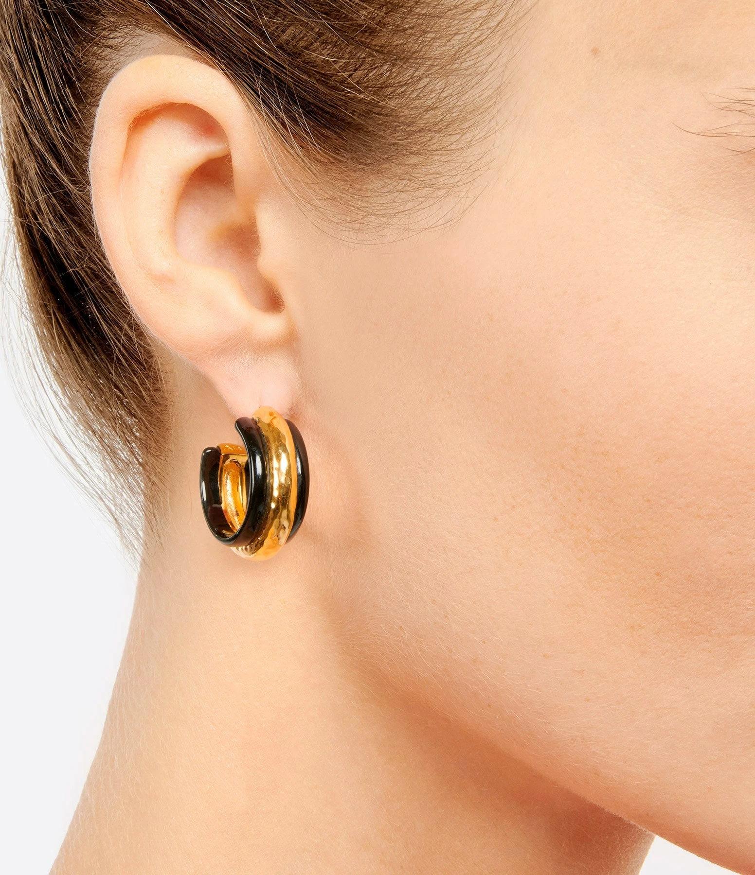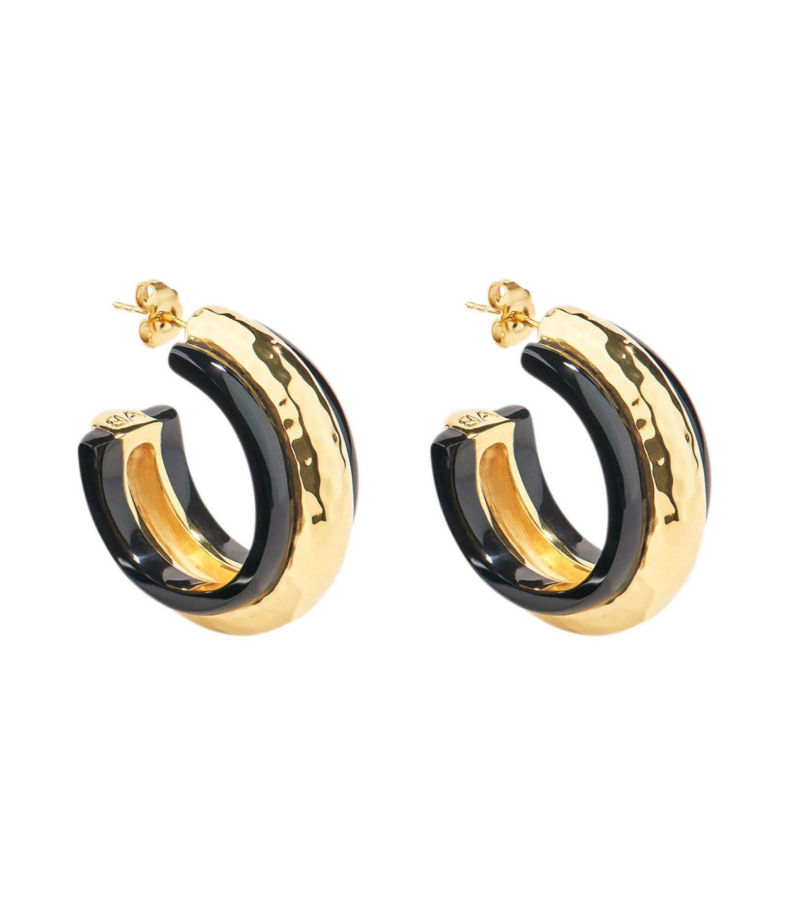 Boucles d’oreilles en bakélite noire avec détails dorés martelés. Fermoirs poussettes.
