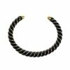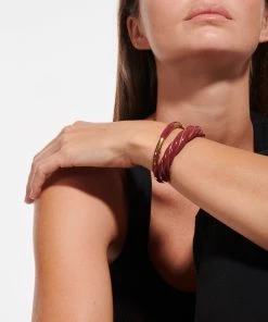 Bracelet jonc torsadé en bakélite bordeaux, parcouru d’un fil doré. Jonc rigide, non réglable.