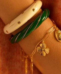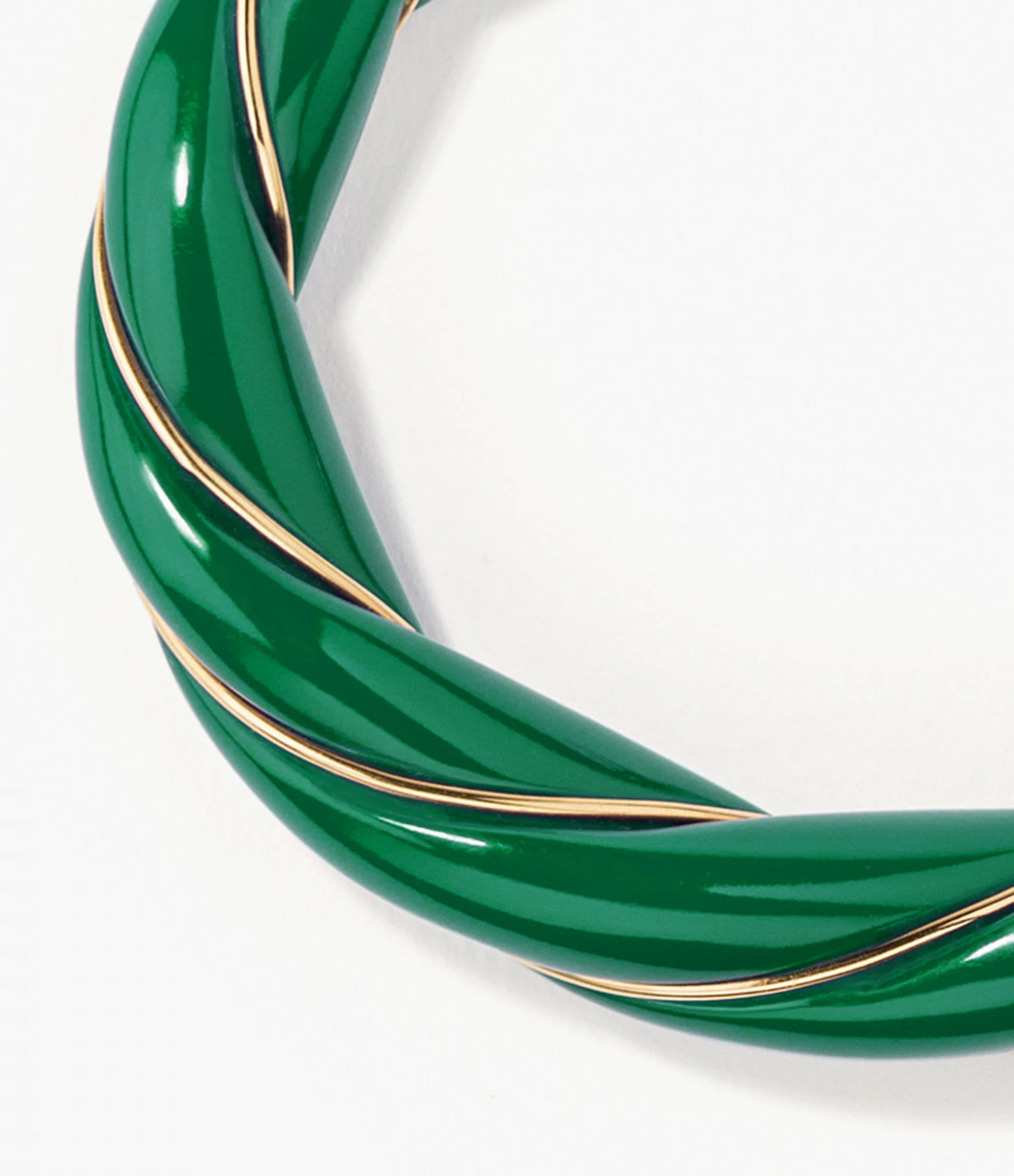 Bracelet jonc torsadé en bakélite vert émeraude, parcouru d’un fil doré. Jonc rigide, non réglable.