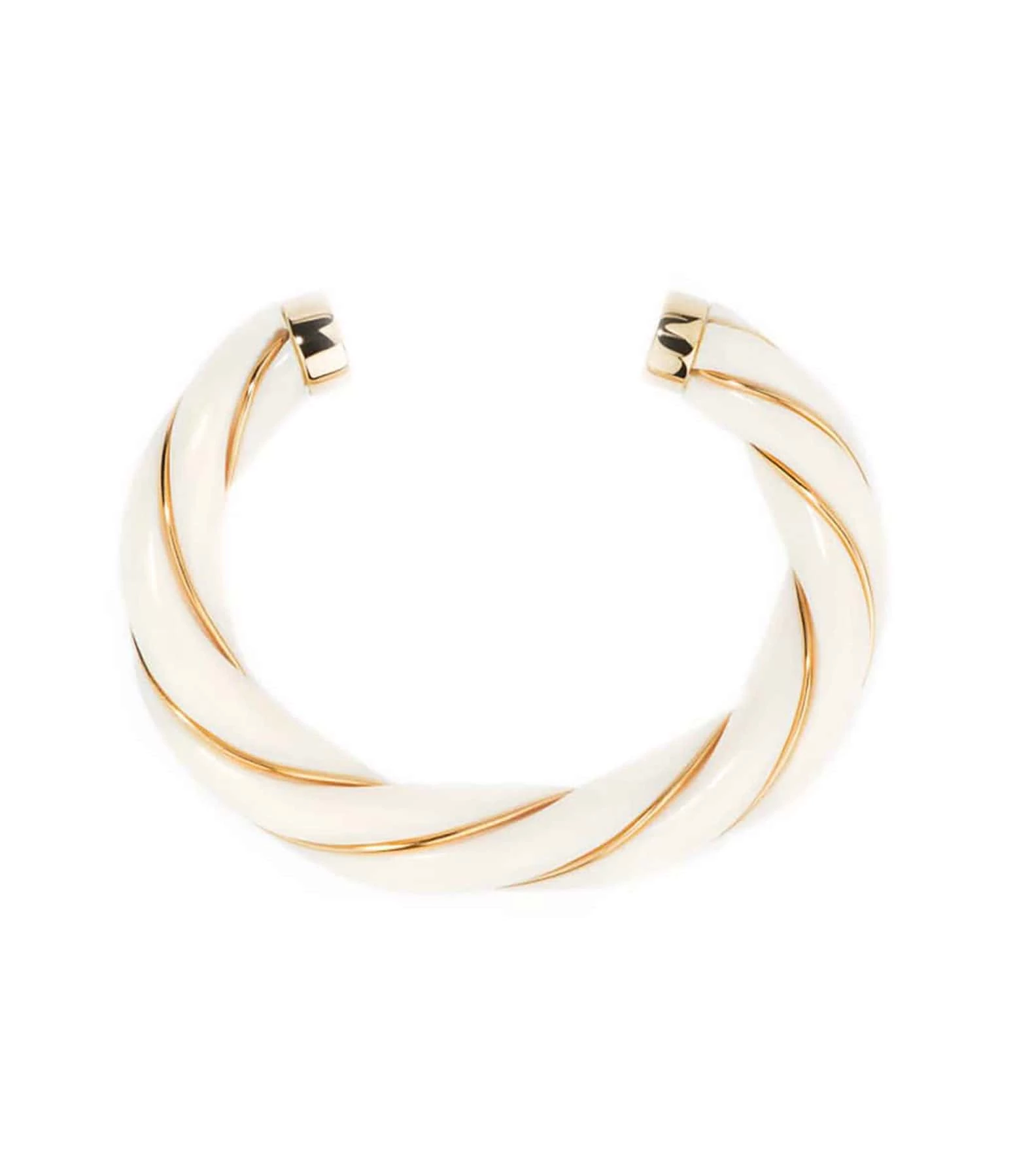 Bracelet jonc torsadé en bakélite ivoire, parcouru d’un fil doré. Jonc rigide, non réglable.