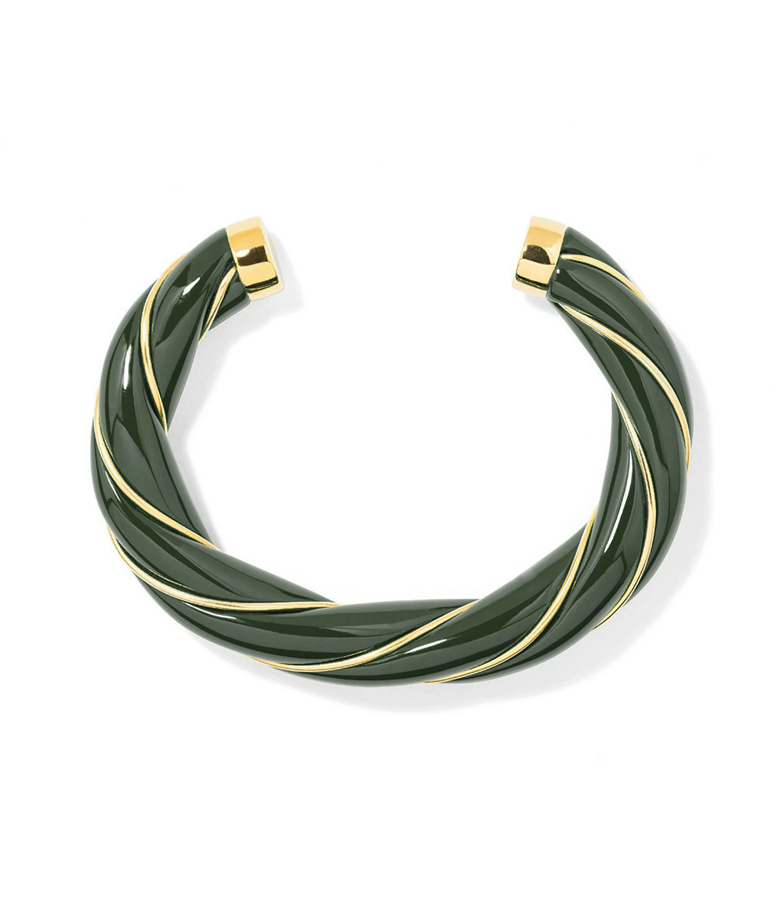 Bracelet jonc torsadé en bakélite kaki, parcouru d’un fil doré. Jonc rigide, non réglable.