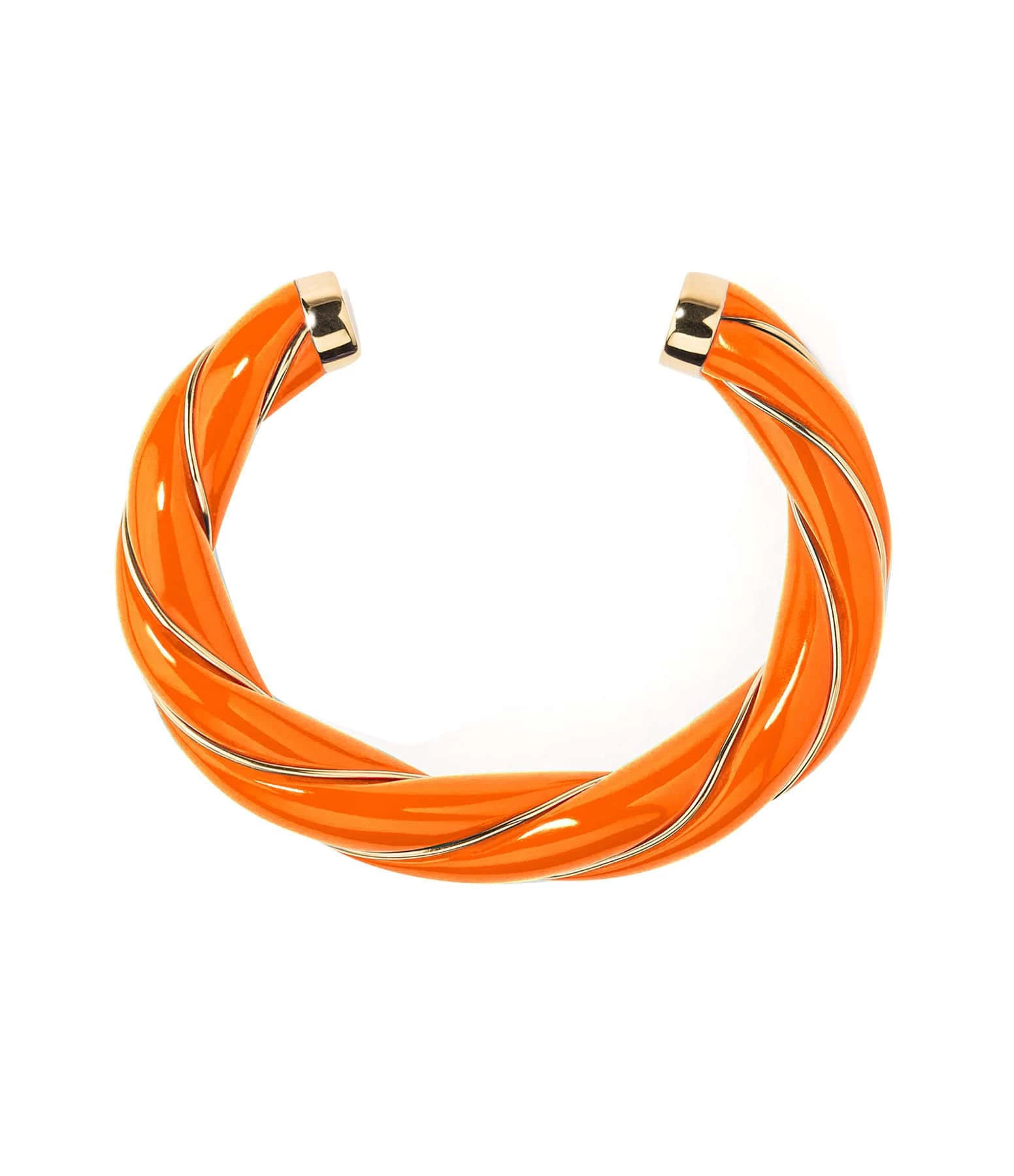 Bracelet jonc torsadé en bakélite orange, parcouru d’un fil doré. Jonc rigide, non réglable.