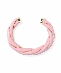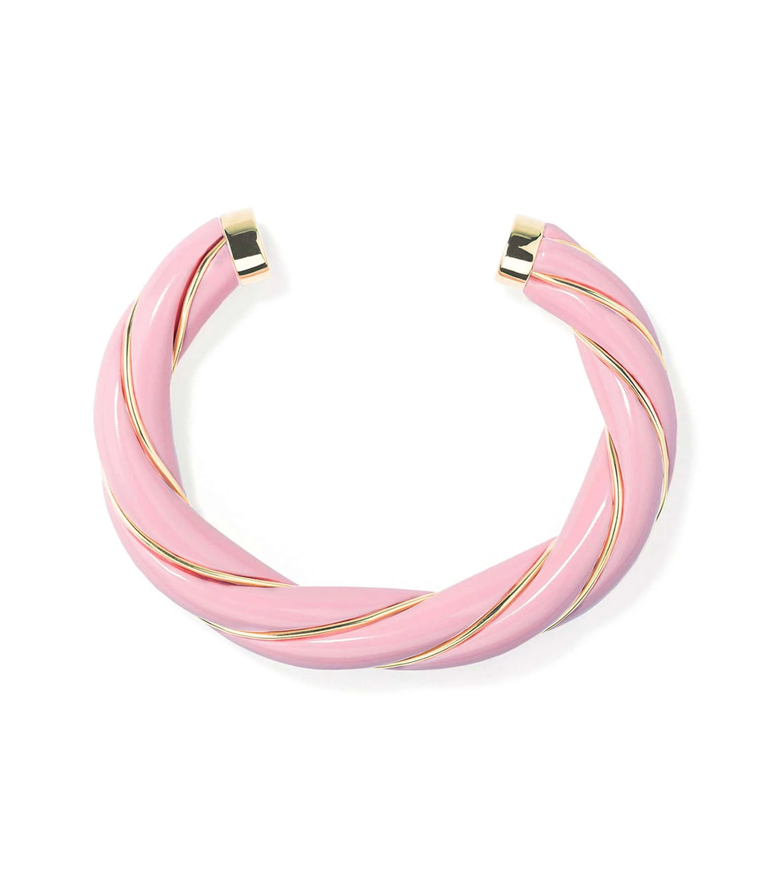 Bracelet jonc torsadé en bakélite rose, parcouru d’un fil doré. Jonc rigide, non réglable.