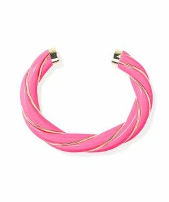 Bracelet jonc torsadé en bakélite rose, parcouru d’un fil doré. Jonc rigide, non réglable.