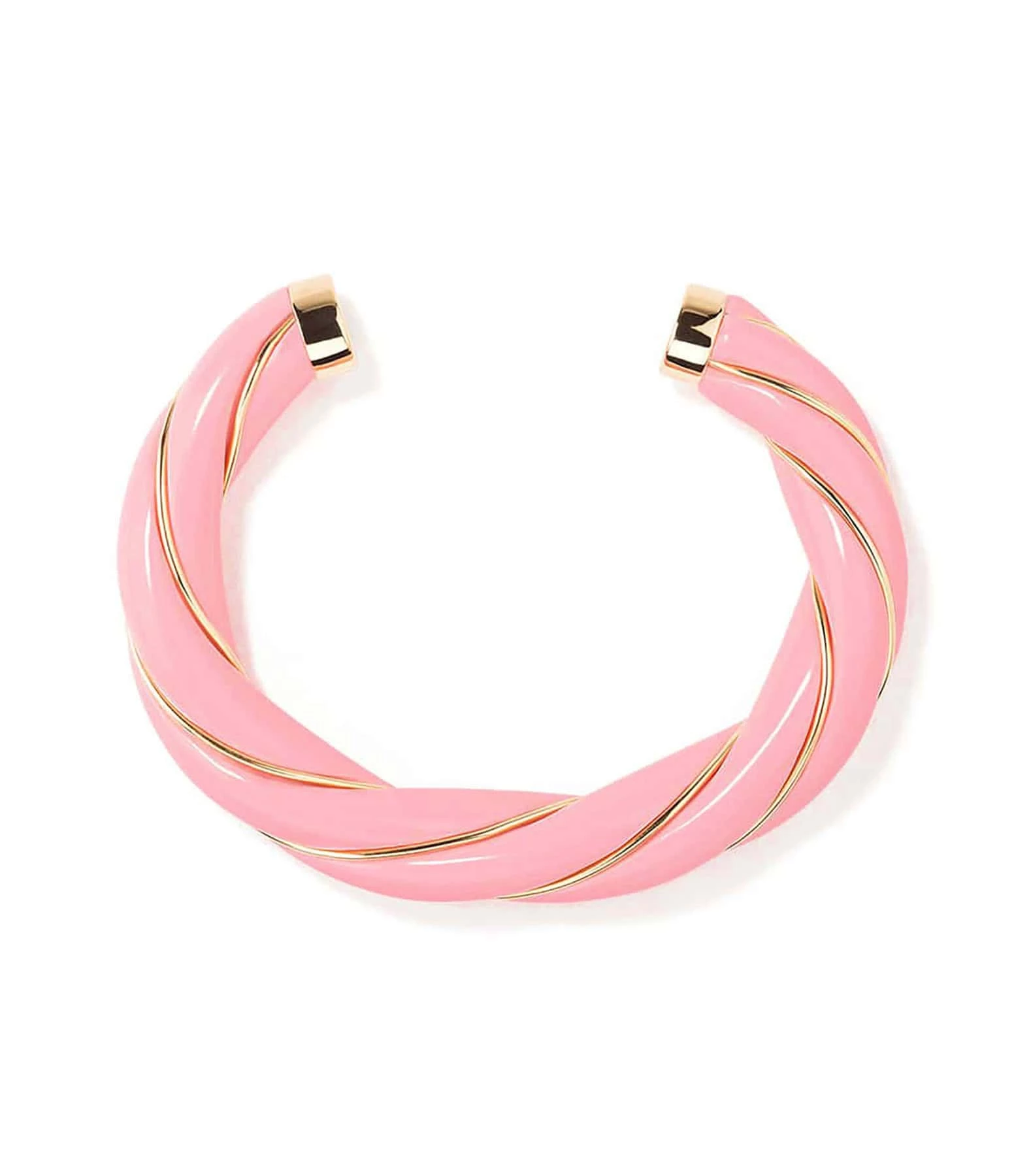 Bracelet jonc torsadé en bakélite rose, parcouru d’un fil doré. Jonc rigide, non réglable.