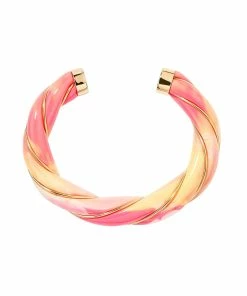 Bracelet jonc torsadé en bakélite tie & dye rose jaune et orange, parcouru d’un fil doré. Jonc rigide, non réglable.