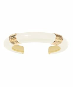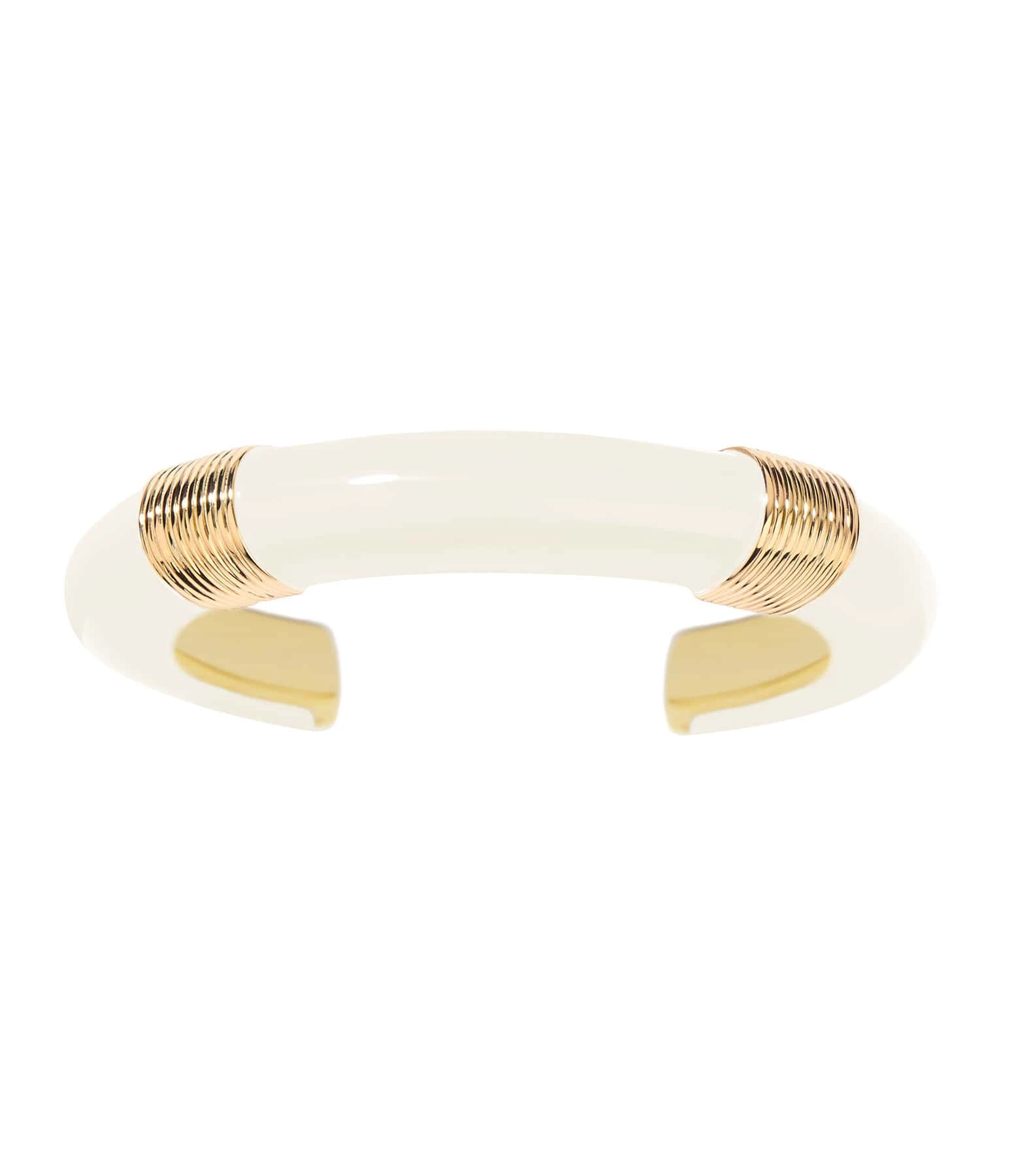 Bracelet jonc en bakélite ivoire, avec détails striés dorés. Jonc rigide, non réglable.