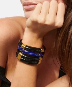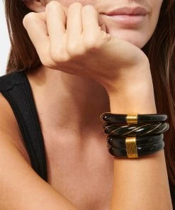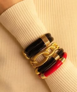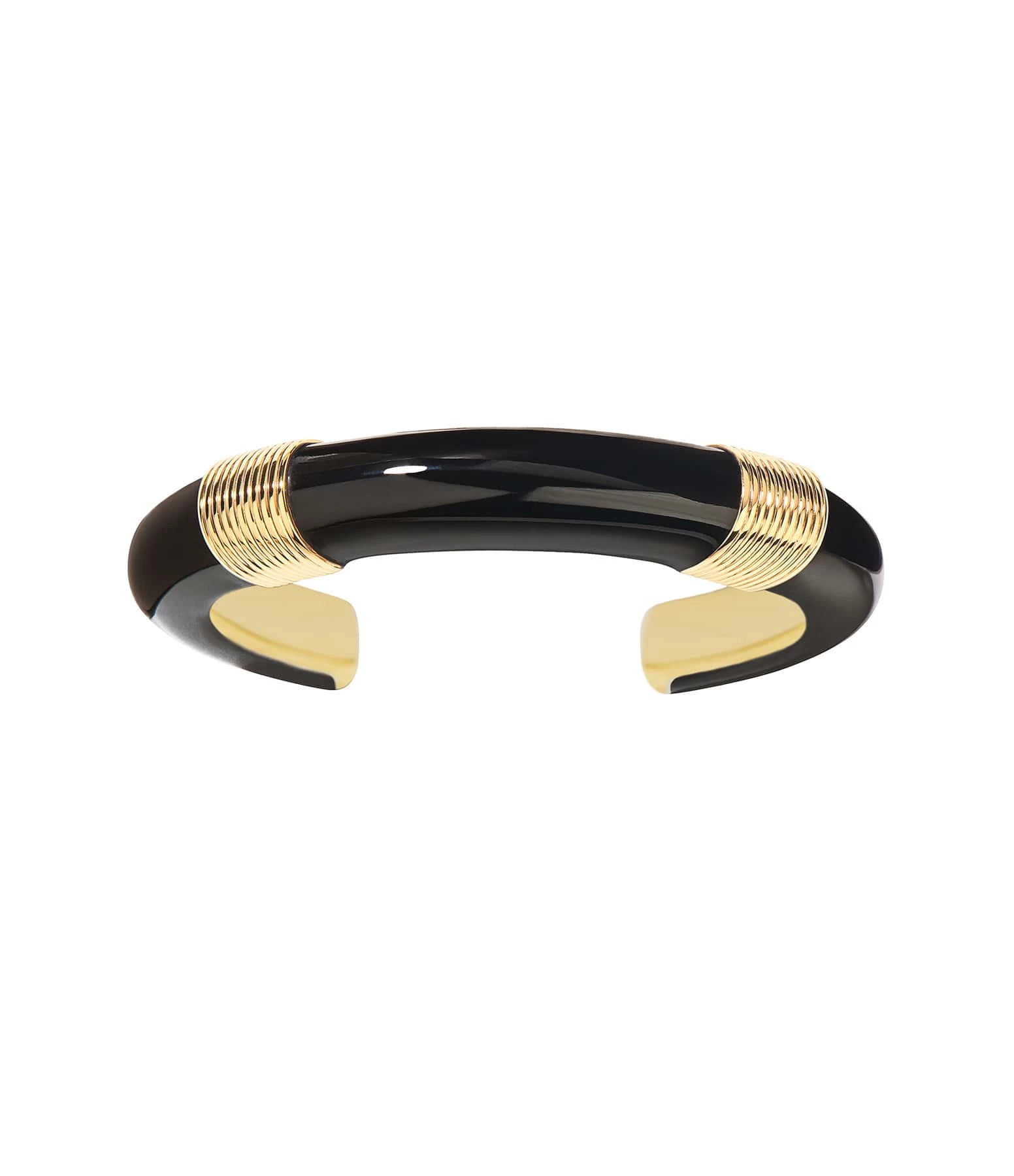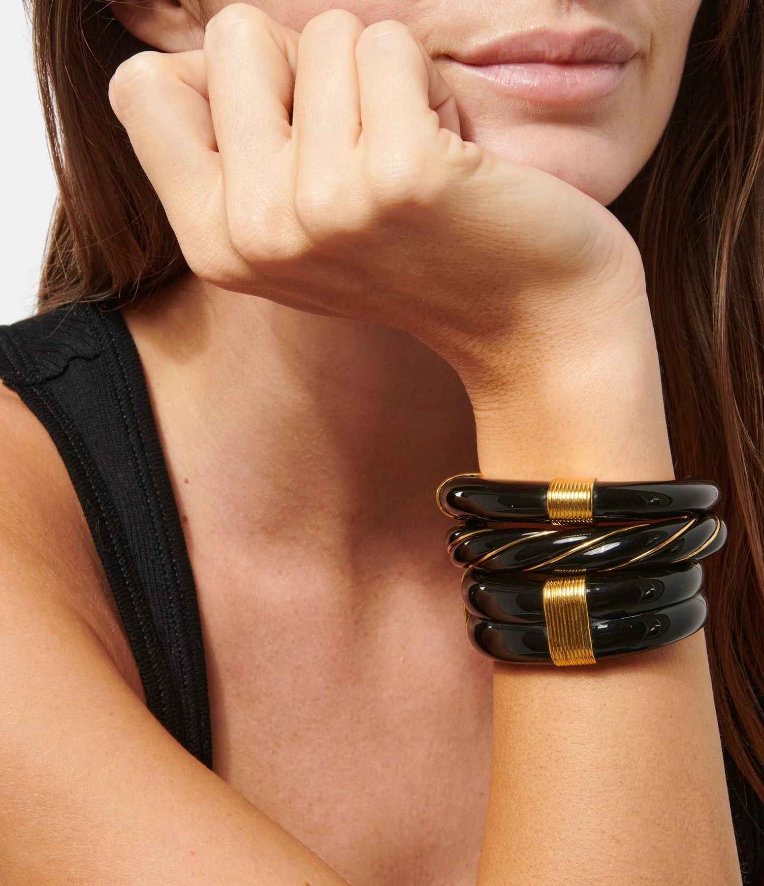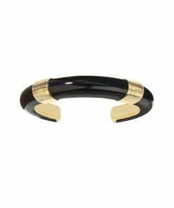 Bracelet jonc en bakélite noire, avec détails striés dorés. Jonc rigide, non réglable.