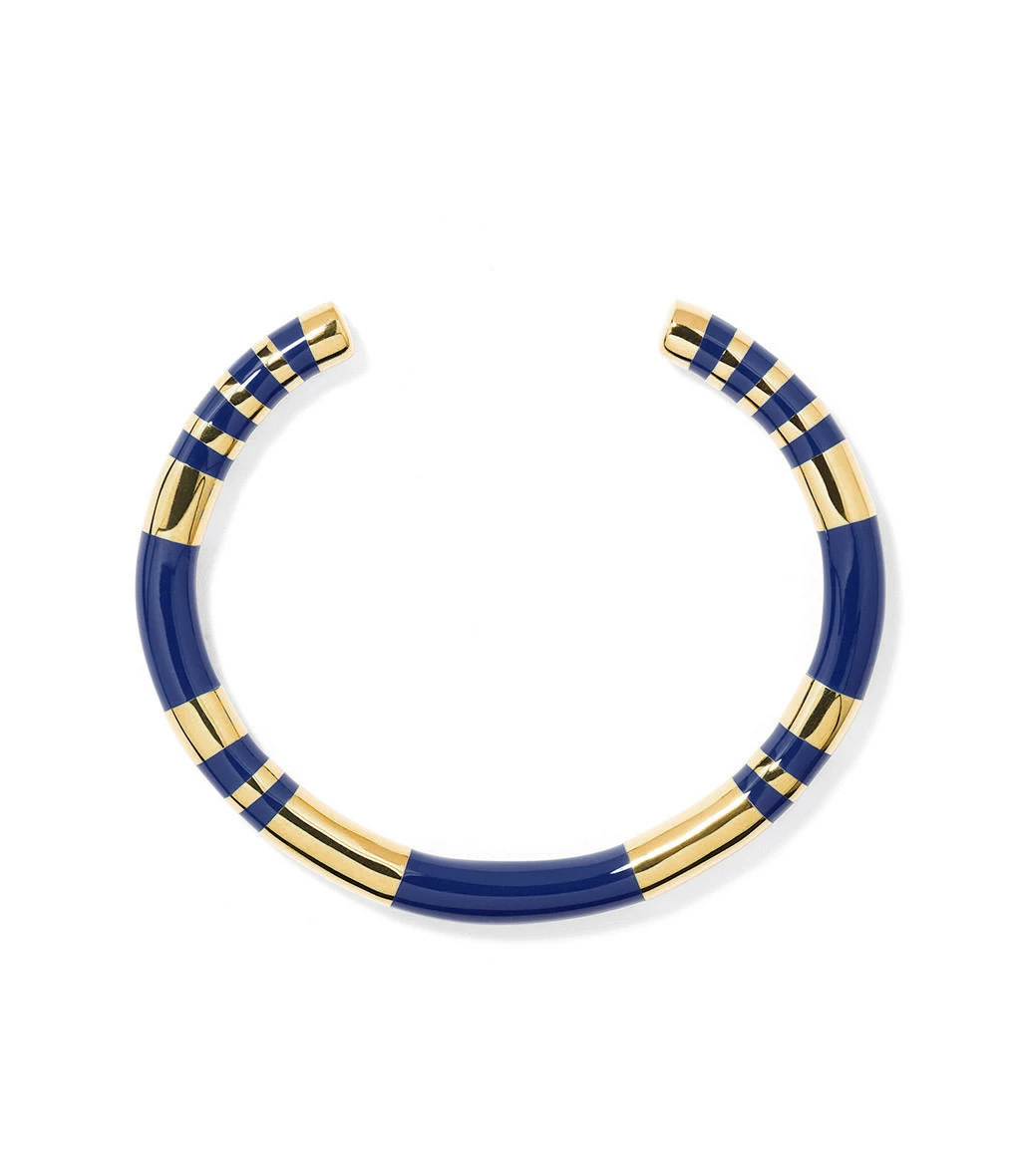 Bracelet jonc doré avec rayures en bakélite bleu électrique. Jonc rigide, non réglable.