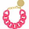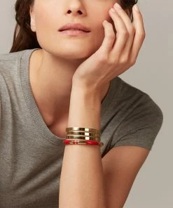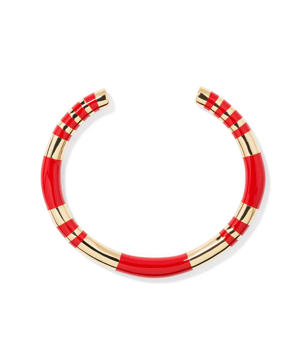 Bracelet jonc doré avec rayures en bakélite rouge corail. Jonc rigide, non réglable.