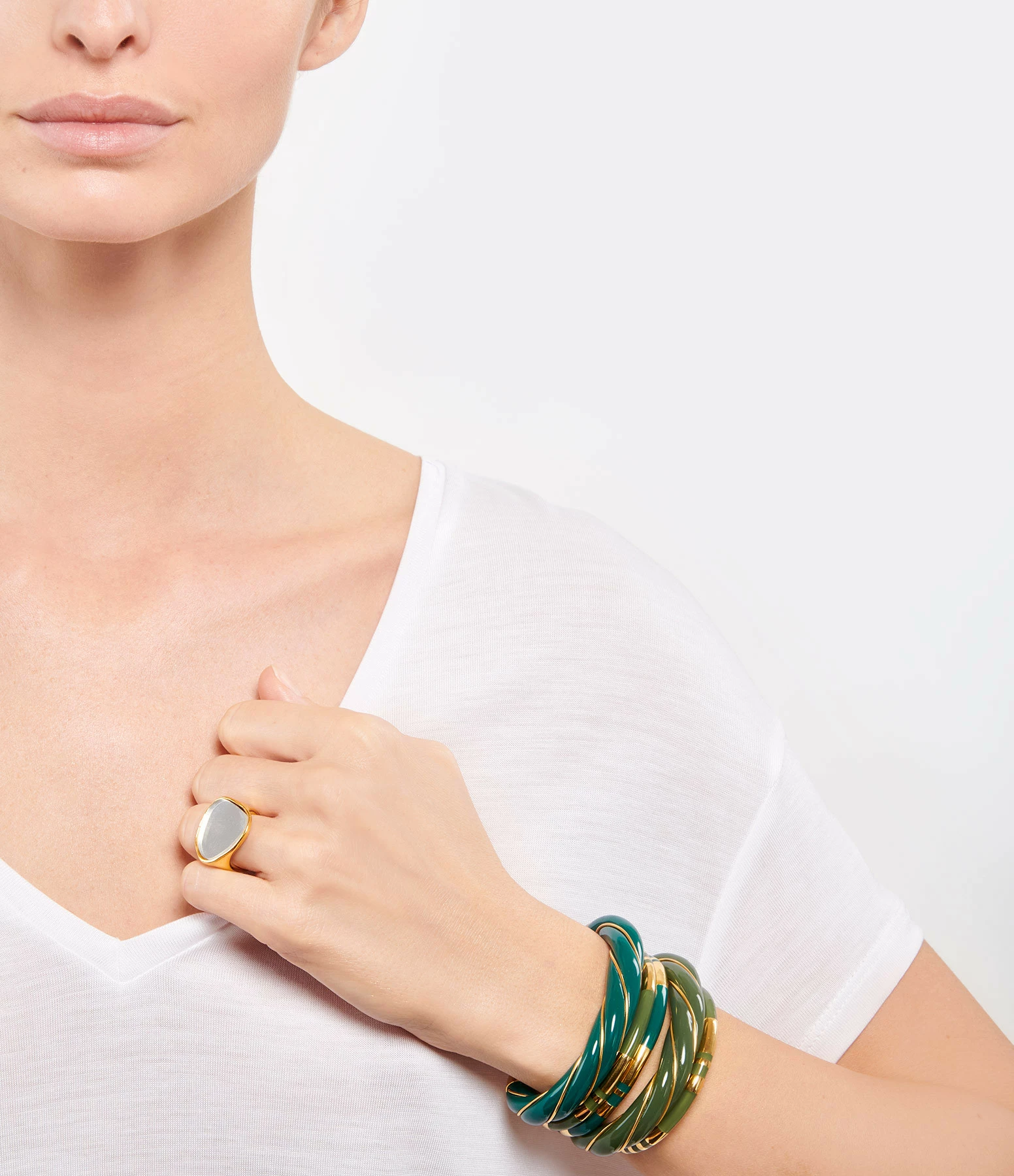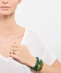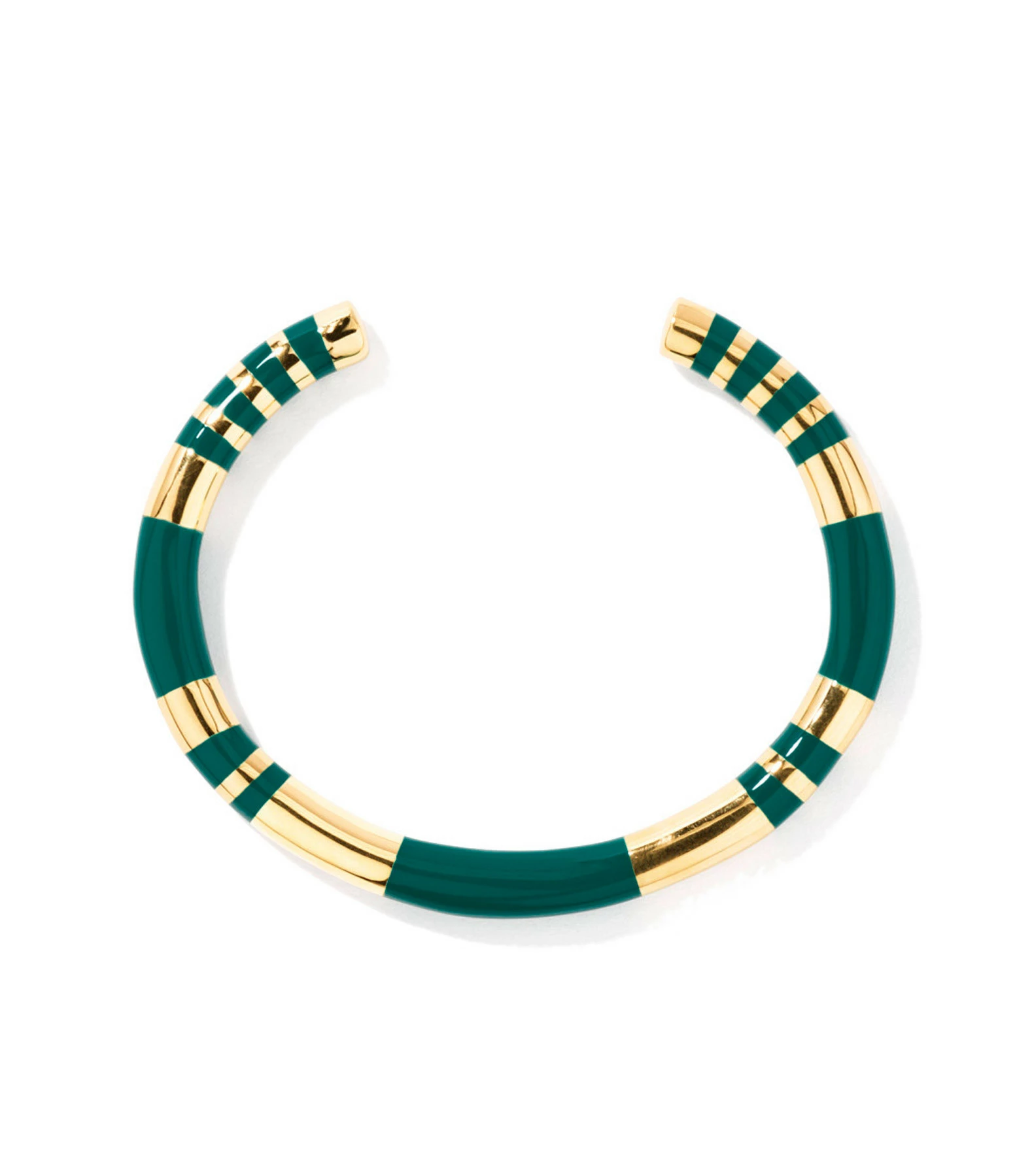 Bracelet jonc doré avec rayures en bakélite vert émeraude. Jonc rigide, non réglable.