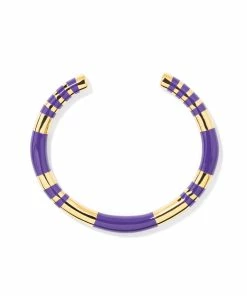 Bracelet jonc doré avec rayures en bakélite violet. Jonc rigide, non réglable.