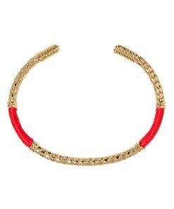 Bracelet jonc doré texturé avec fil de coton rouge vermilon. Jonc rigide, non réglable.