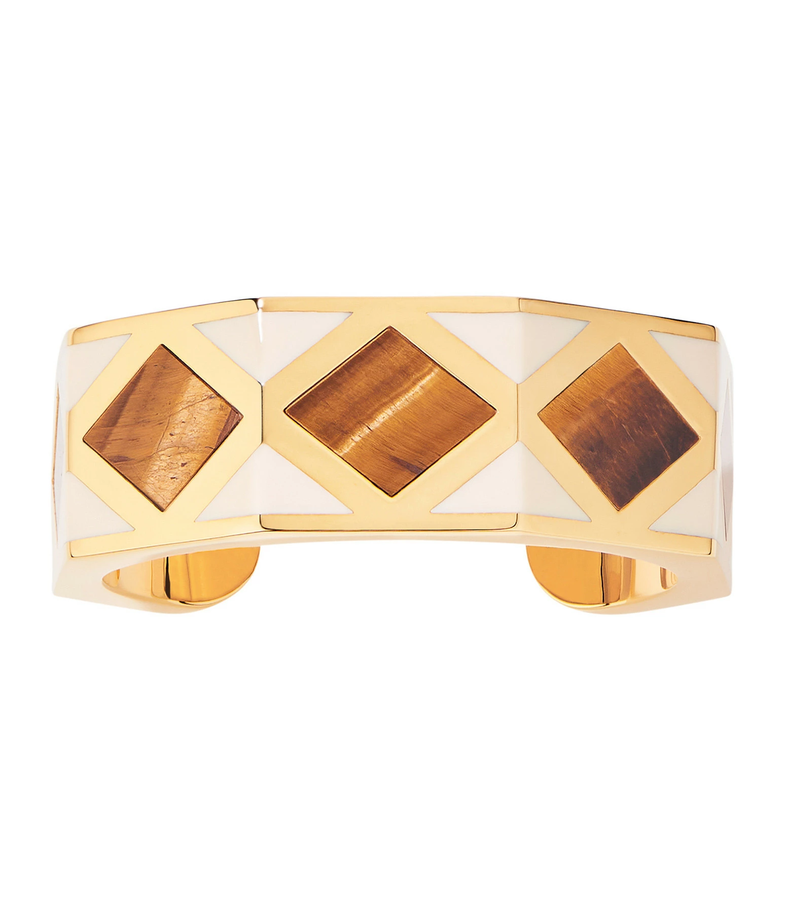 Bracelet manchette carrée dorée, avec inclusions en œil de tigre et bakélite ivoire.