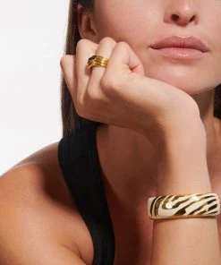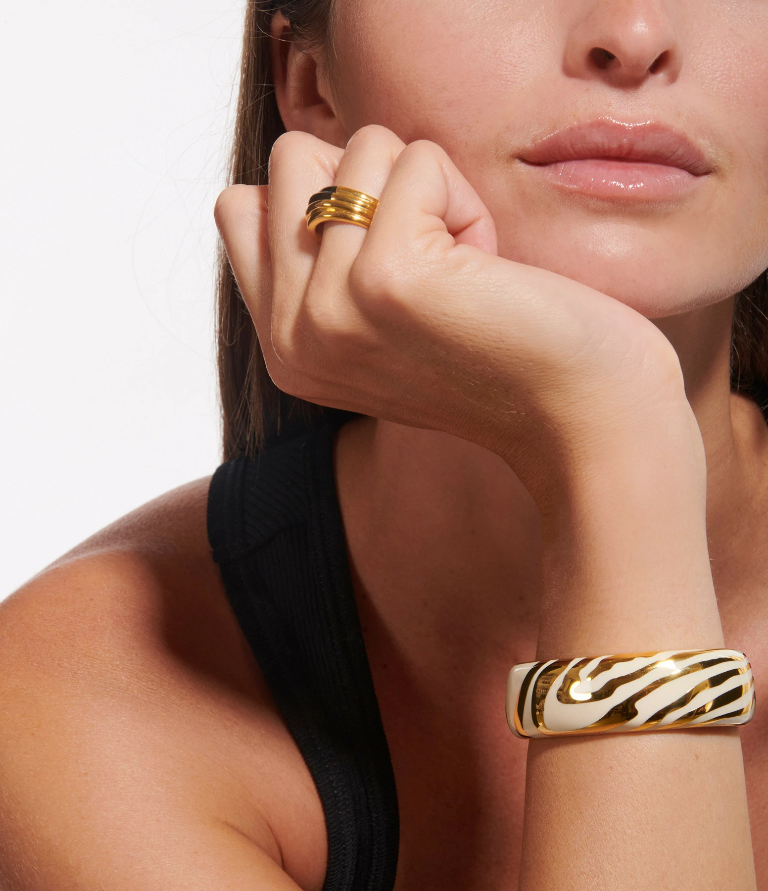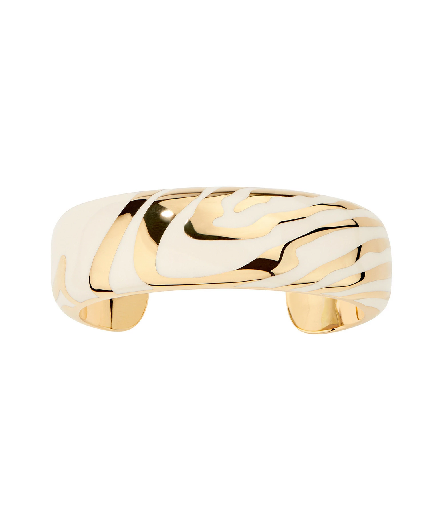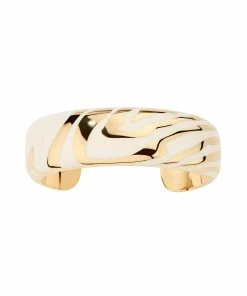 Bracelet manchette dorée effet marbré en bakélite ivoire. Manchette rigide, non réglable.