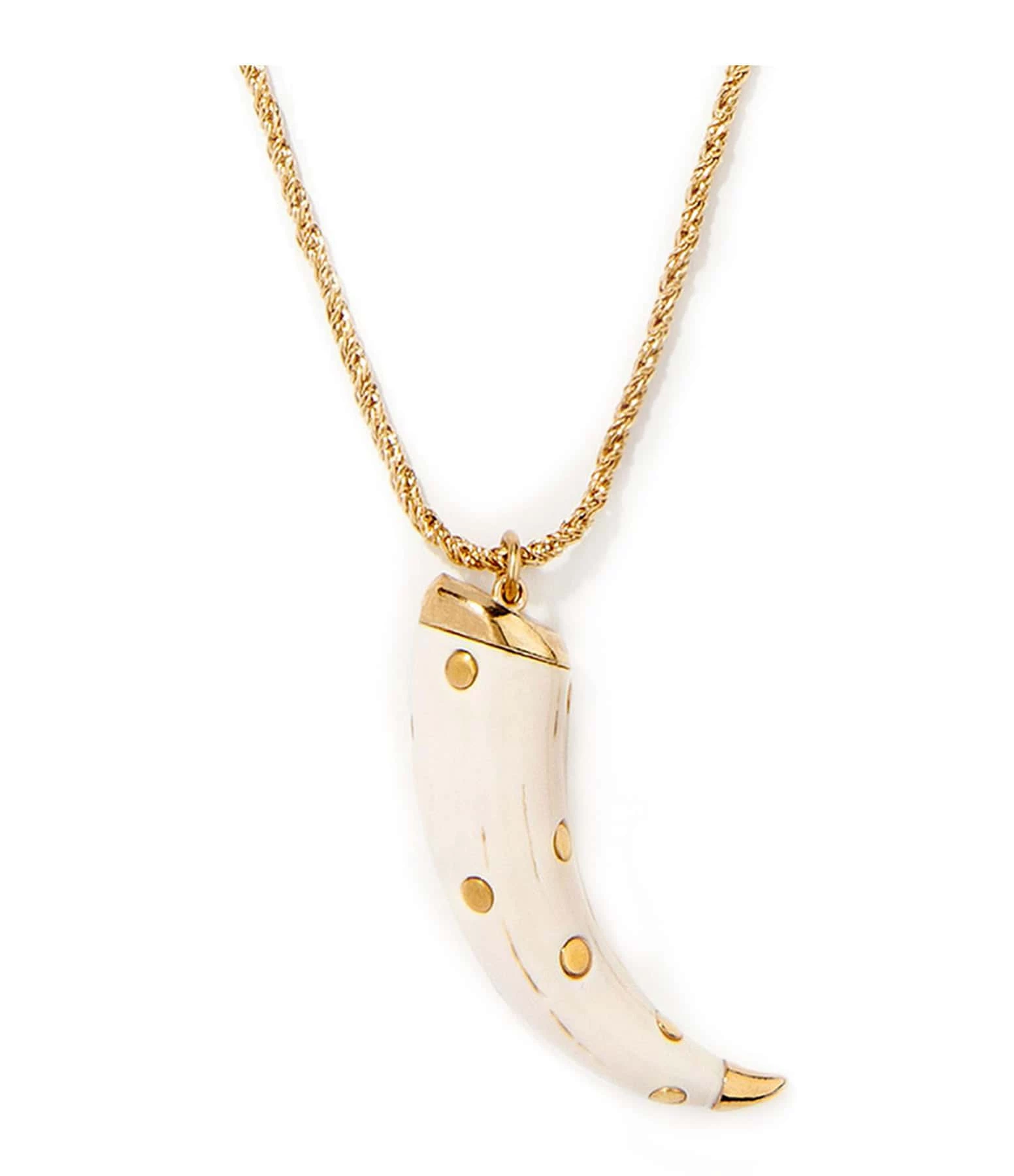 Sautoir avec pendentif corne en bakélite ivoire ornée de clous dorés. Fermoir trombone iconique de la maison.