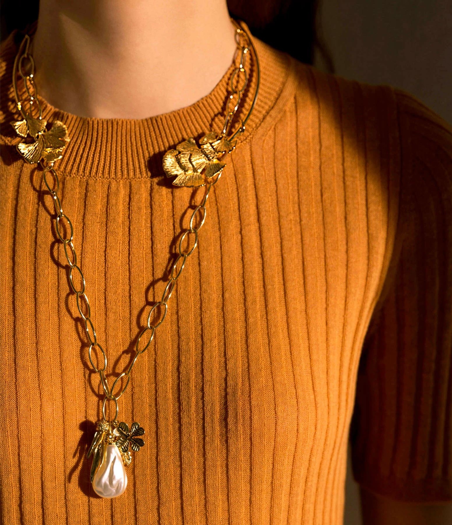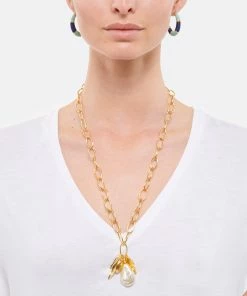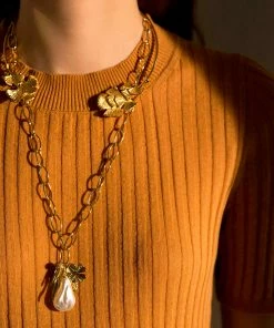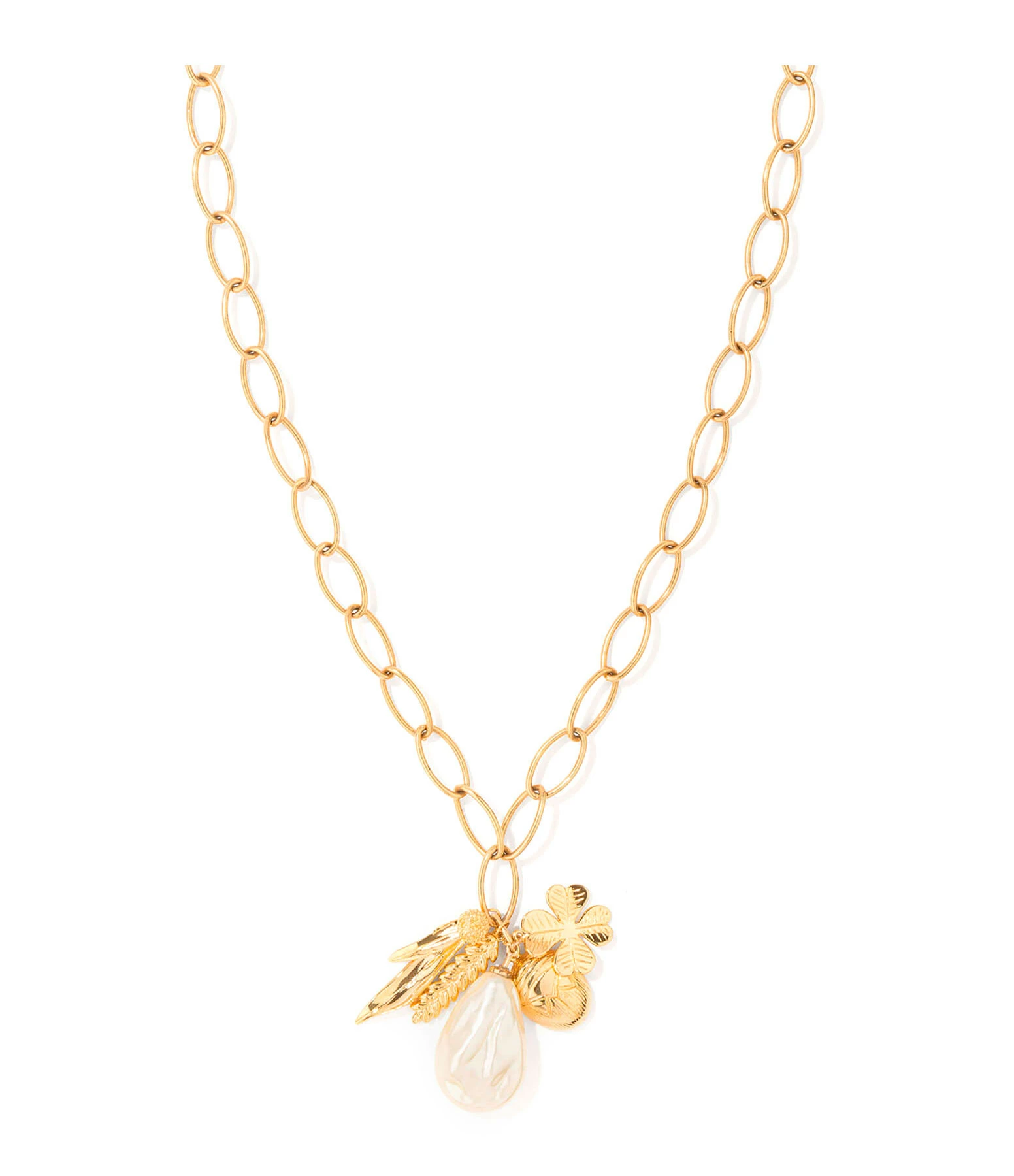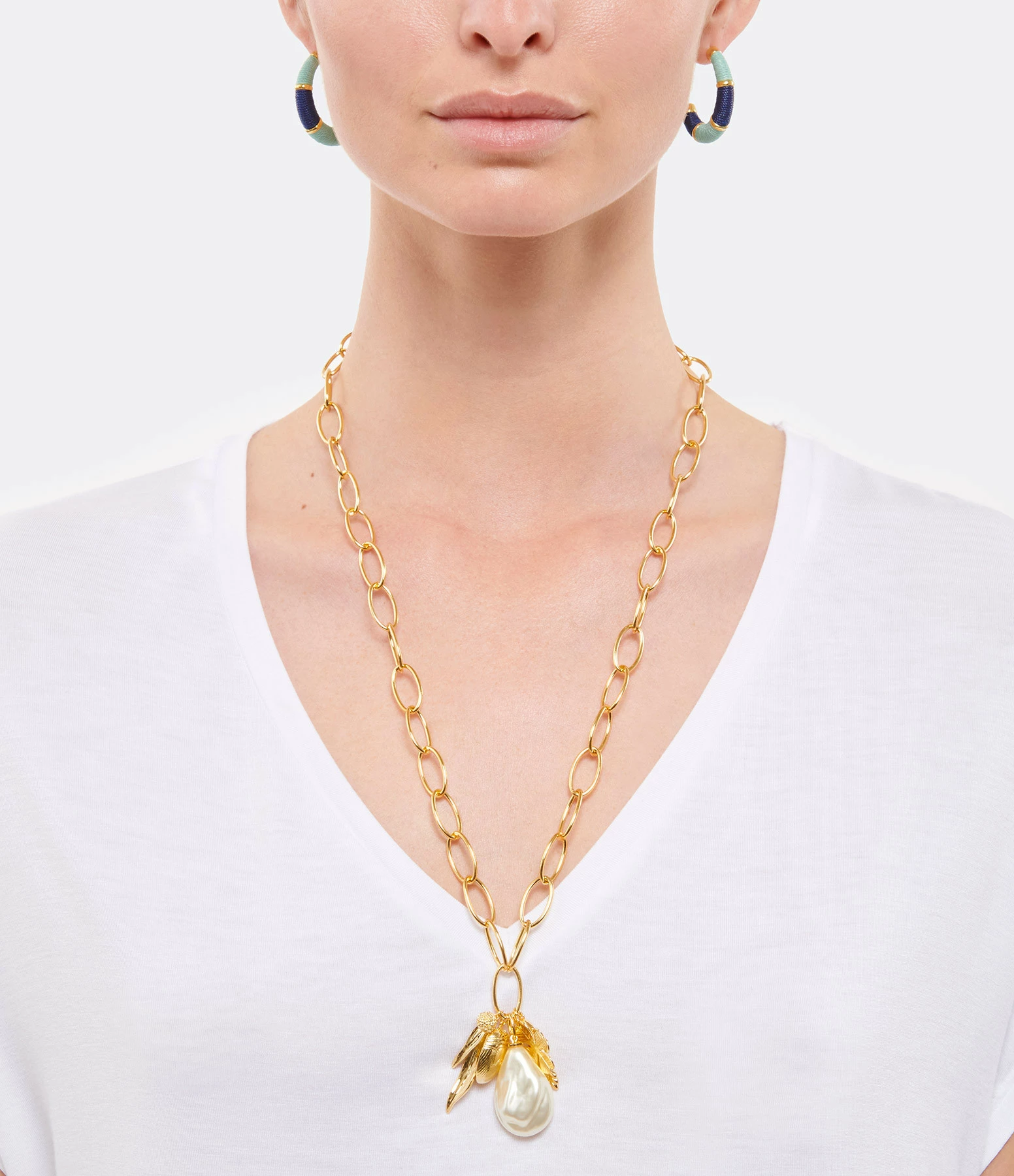 Sautoir orné d’une perle de verre et de charms emblématiques de la maison Aurélie Bidermann : le scarabée, le trèfle, l’épi de blé et le mimosa. Fermoir trombone iconique de la maison.
