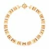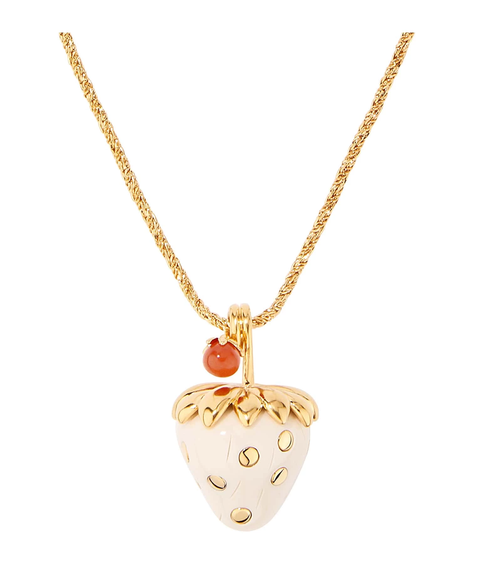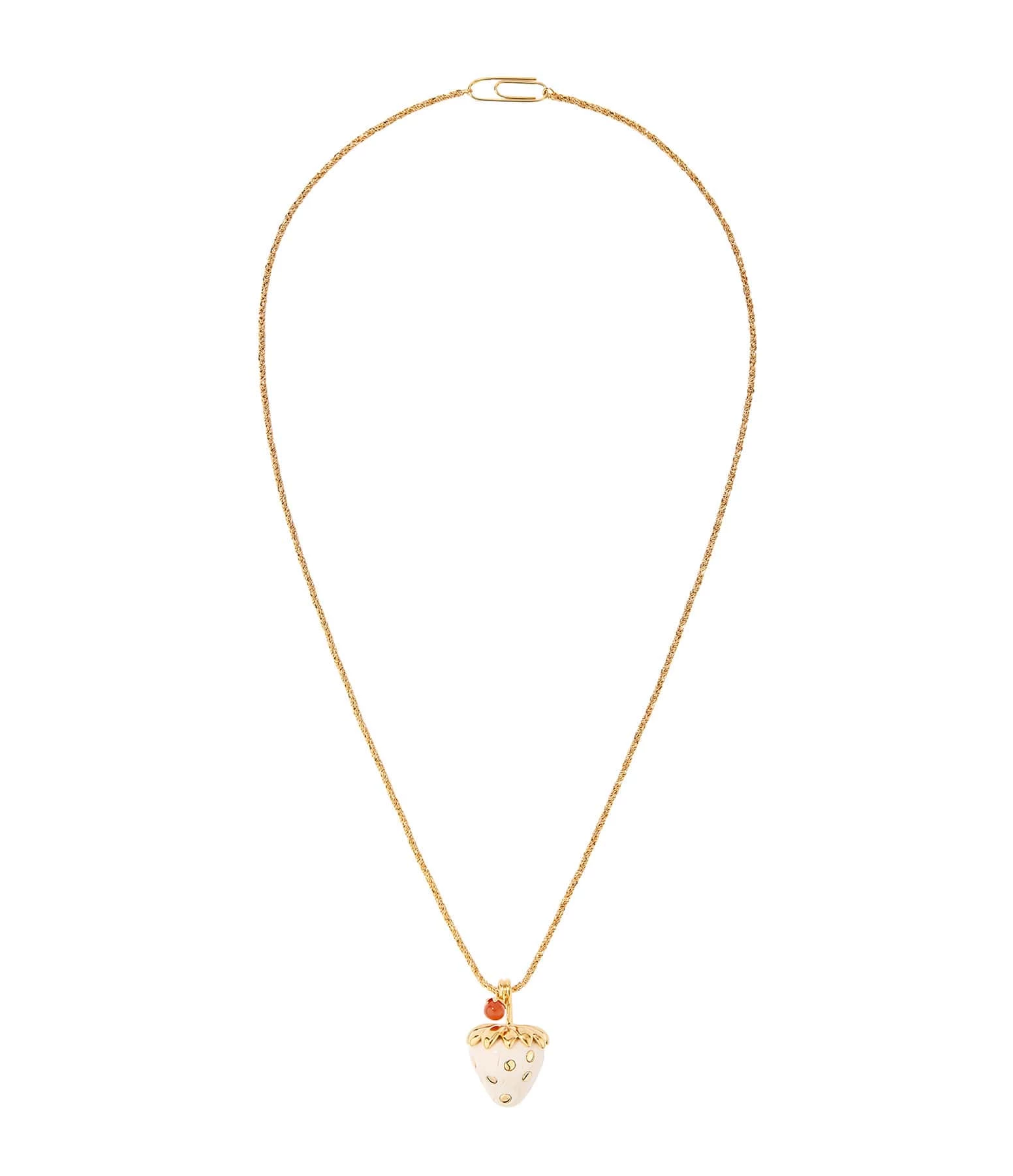 Collier long doré avec pendentif fraise en bakélite ivoire et inclusions dorées, et petite cornaline. Fermoir trombone iconique de la maison.