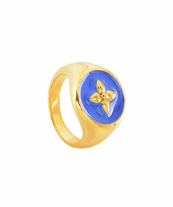 Chevalière ronde en vermeil et résine bleue avec symbole fleur “croisette de printemps”.