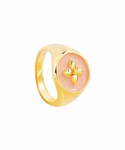 Chevalière ronde en vermeil et résine rose pale avec symbole fleur “croisette de printemps”.