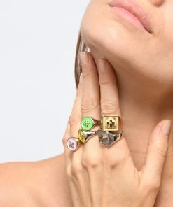 Chevalière ronde en vermeil et résine rose pâle avec symbole fleur “croisette de printemps”.