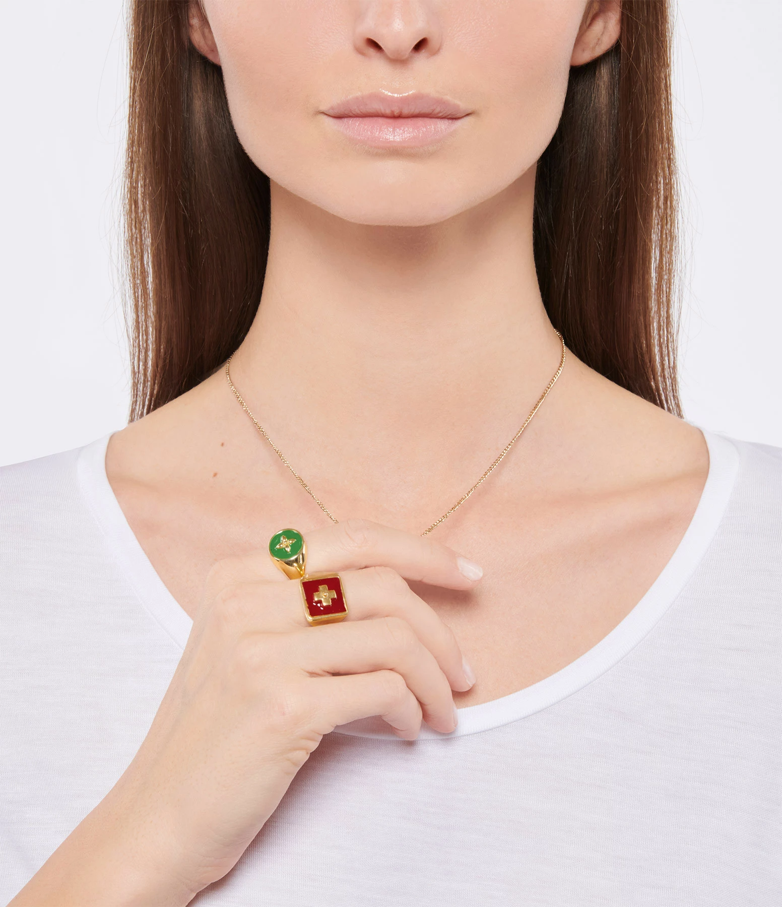 Chevalière ronde en vermeil et résine verte avec symbole fleur “croisette de printemps”.