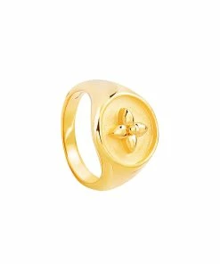 Chevalière ronde en vermeil poli brillant, le centre sablé avec symbole fleur “croisette de printemps”.