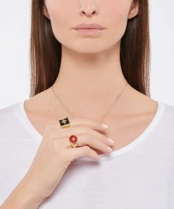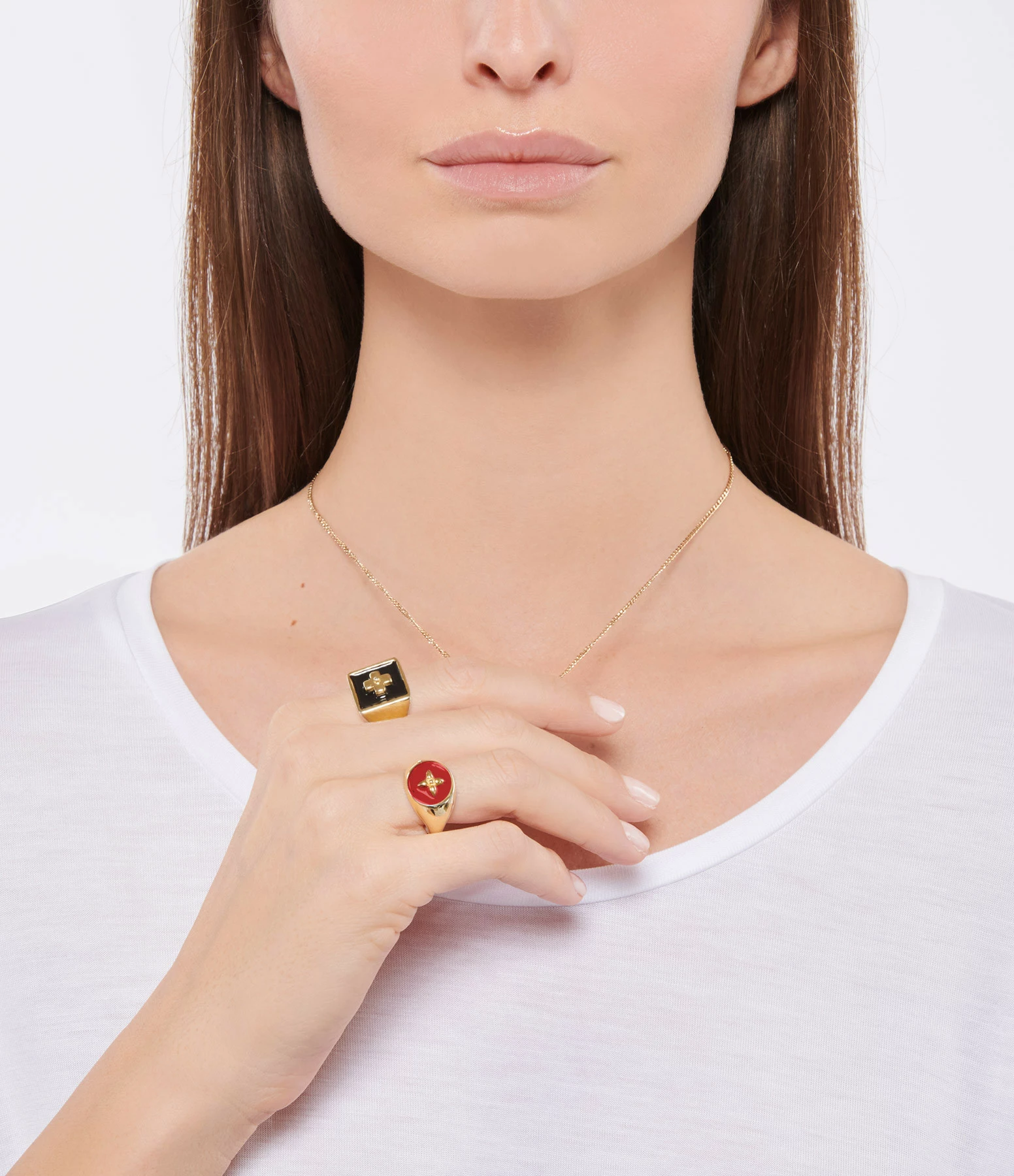 Chevalière carrée en vermeil et résine noire avec symbole “+”.