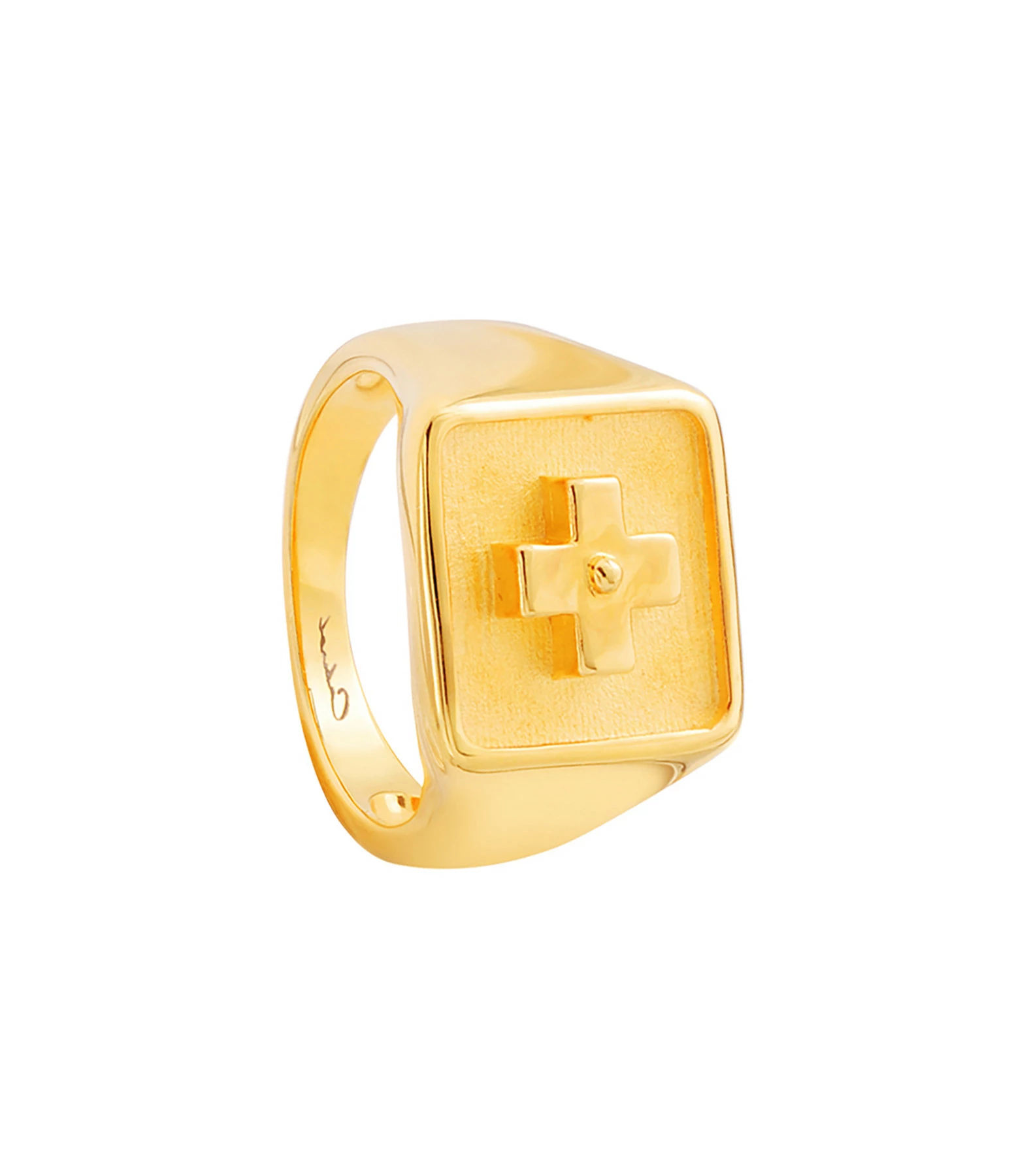Chevalière carrée en vermeil avec symbole “+”.