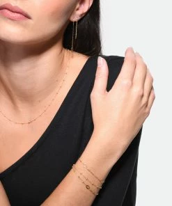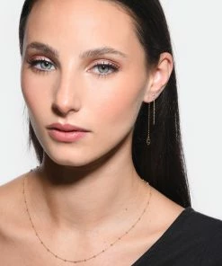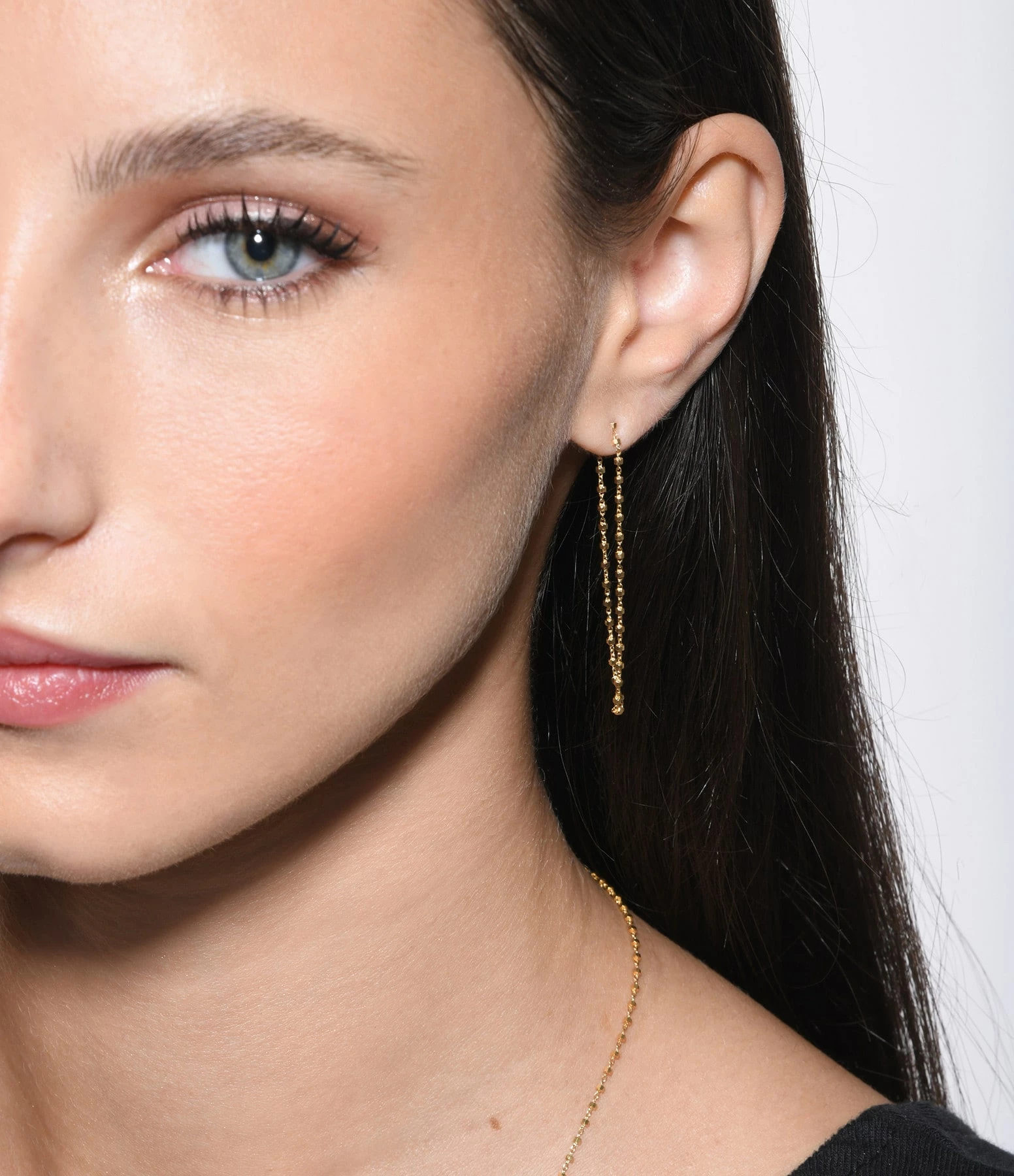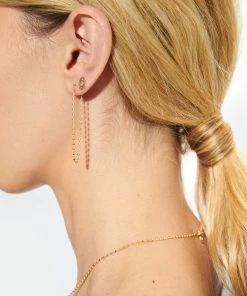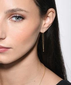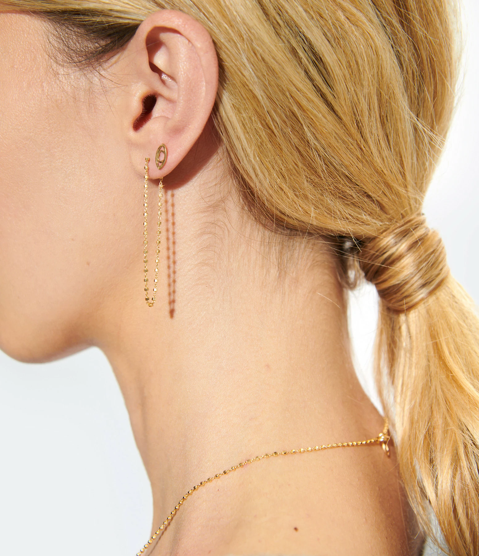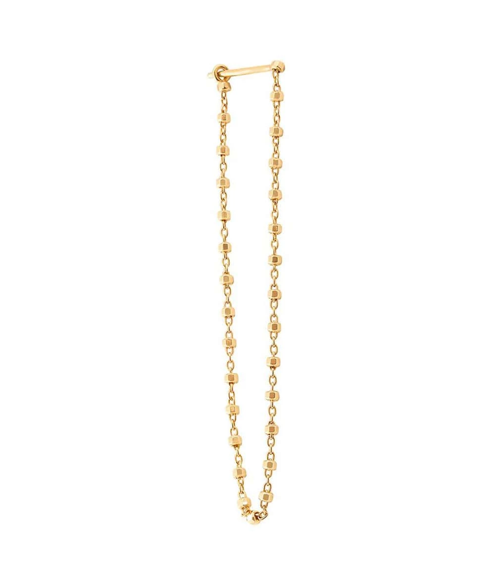 Boucle d’oreille en or jaune composée d’une chaîne en maille diamantée (ornée de petites perles facettées). Peut se porter pendante ou remontée sur le fermoir à l’arrière du lobe. Fermoir poussette.