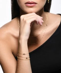 Chaîne de cheville en or jaune ornée d’un pendentif signature et de deux perles d’eau douce. Fermoir classique à ressort avec contre-anneau.