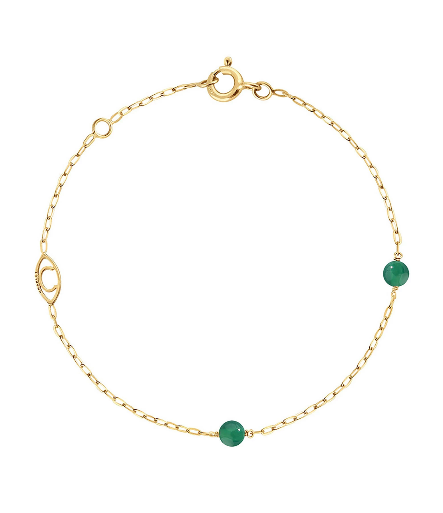 Collier en or jaune composé d’une chaîne en forçat décorée de deux perles agate verte et d’un symbole signé Charlet.