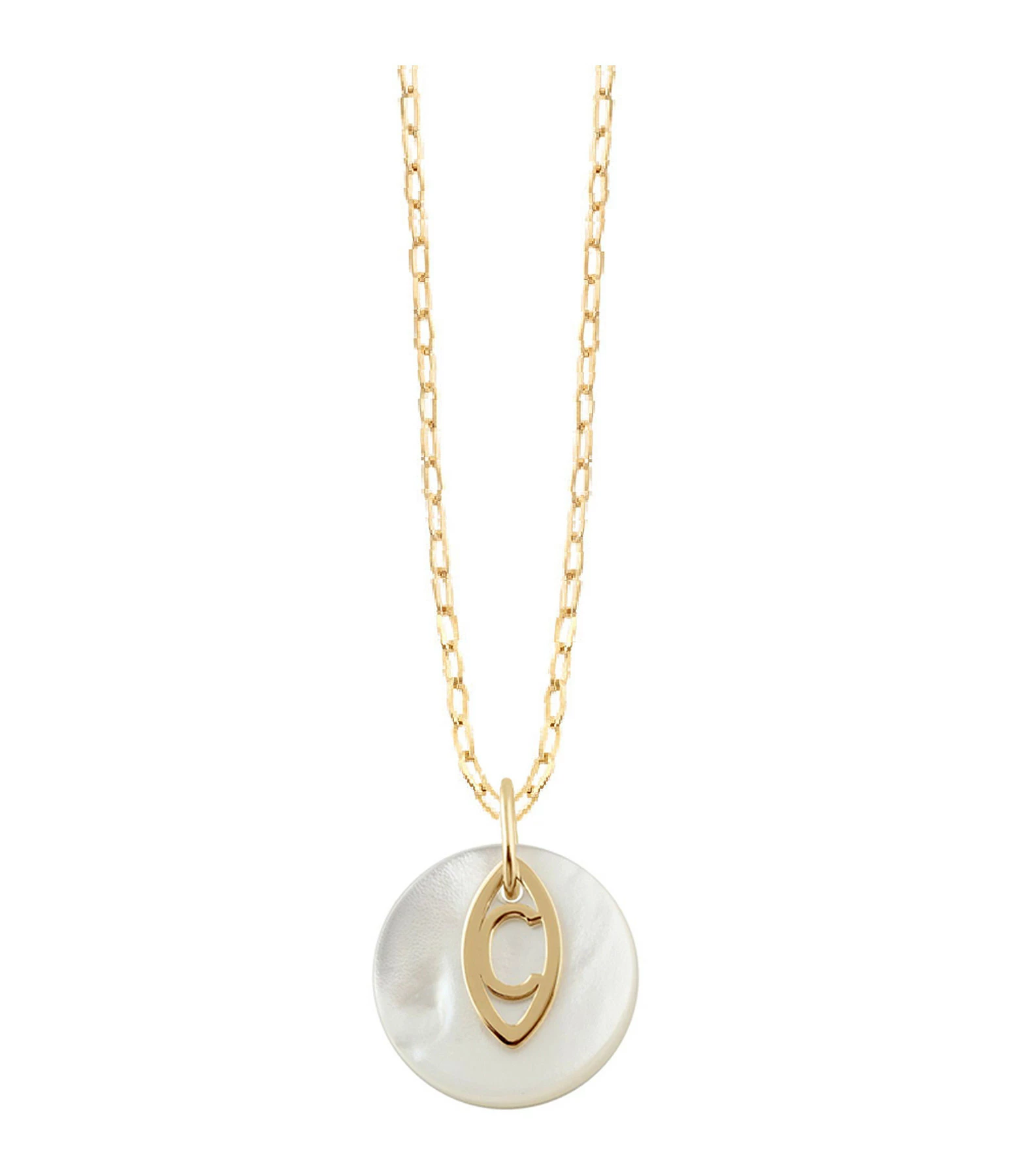 Collier en or jaune sur une chaîne en maille forçat ornée d’une médaille en nacre blanche et de deux charms représentant le symbole Charlet. Fermoir à ressort.