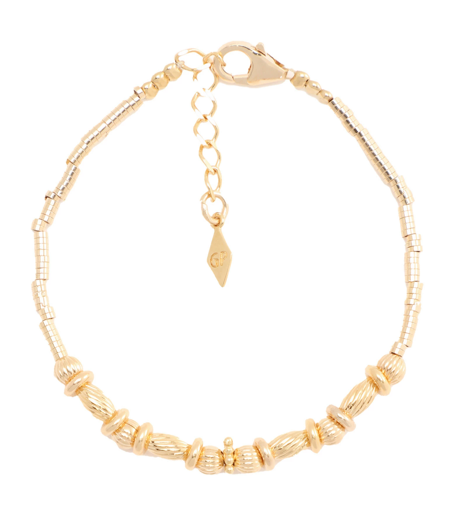 Bracelet de perles en laiton doré. Fermoir mousqueton avec chaînette de réglage.
